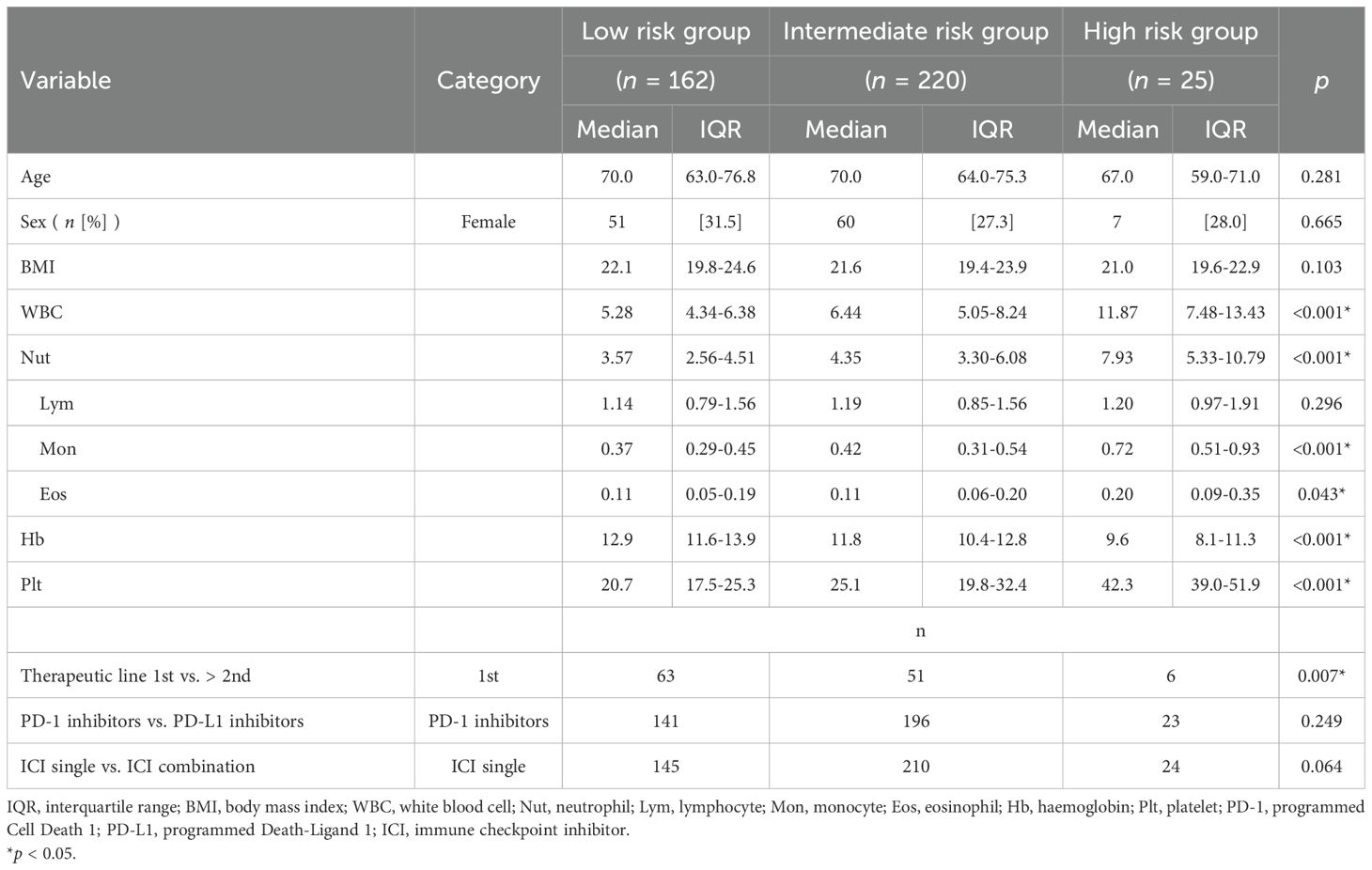 No significant differences were detected in age, sex, or BMI between Khorana score risk categories on univariate analysis. In contrast, laboratory analysis revealed significant differences between risk groups in WBC count, Hb level, and Plt count (p < 0.001). Within the WBC fraction, significant differences were also observed in neutrophil, monocyte, and eosinophil counts between groups. There was a significant difference between the first-line and second-line or later treatment lines (p = 0.007). No difference was observed between programmed cell death 1 inhibitors and programmed death-ligand 1 inhibitors, nor between ICI monotherapy and combination therapy (Table 2).