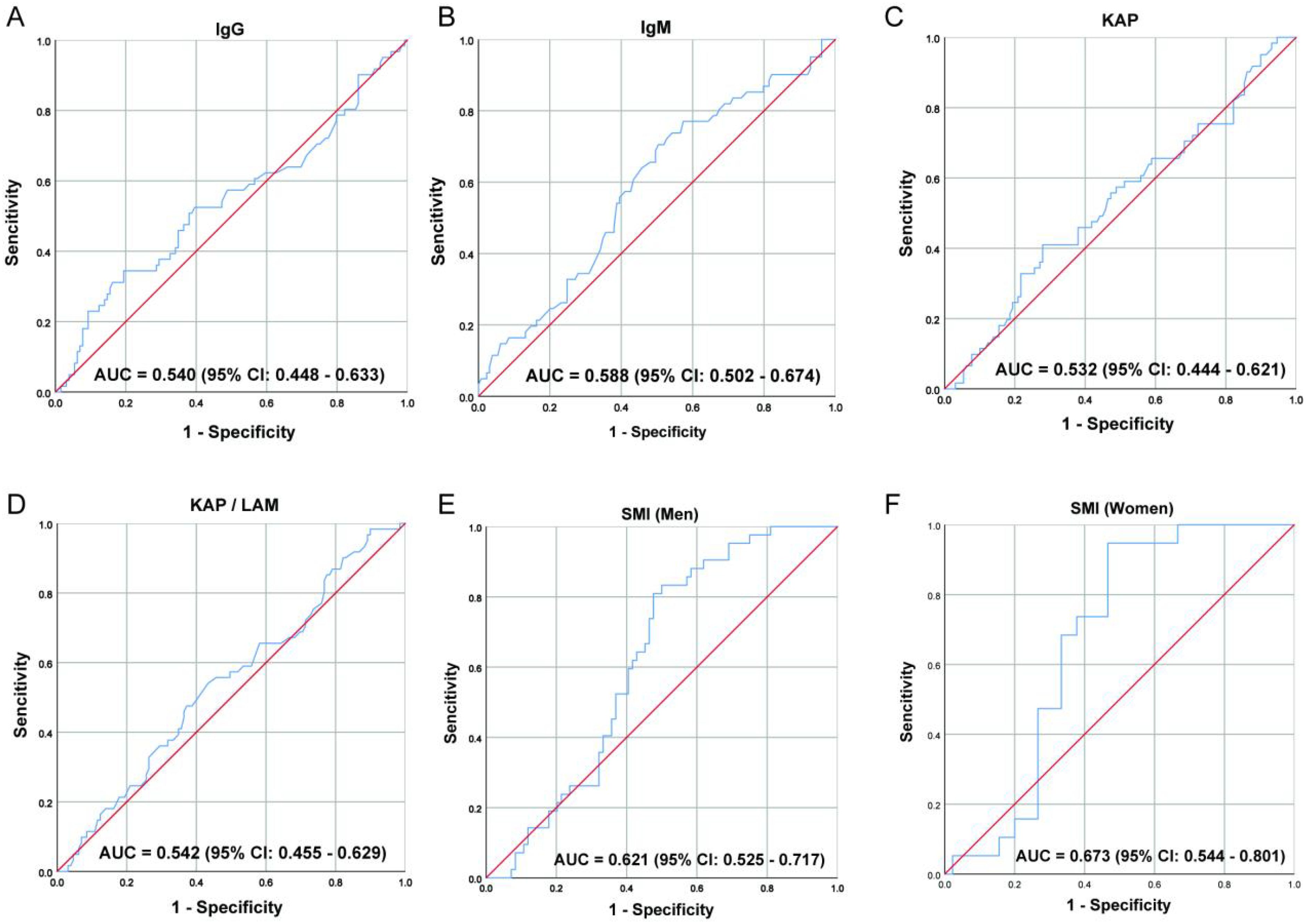 Figure 1. The ROC curve of (A) IgG, (B) IgM, (C) KAP, (D) KAP/LAM, (E) SMI (Men), and (F) SMI (Women).