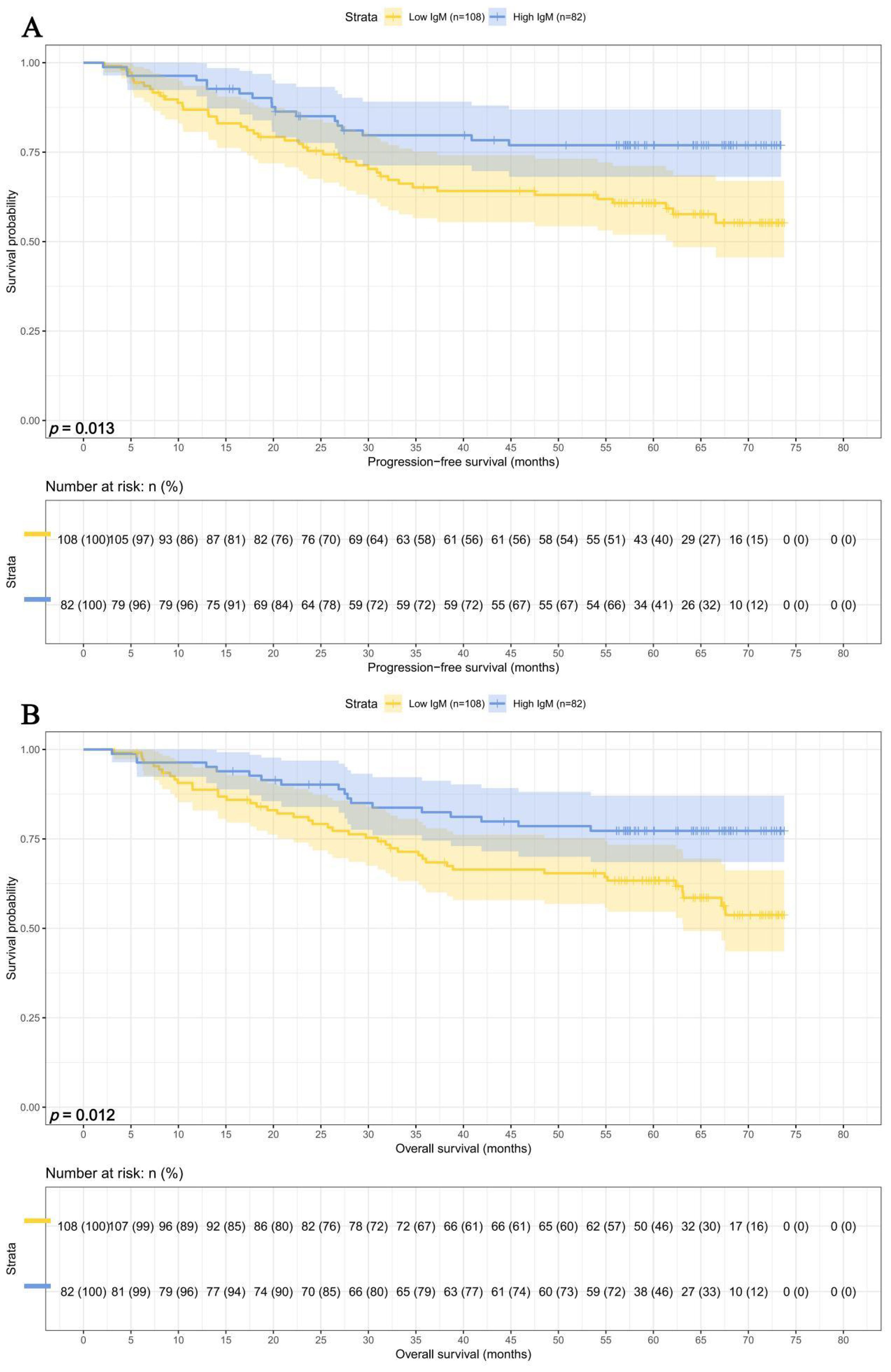 In this study, we performed survival analyses for IgM and SMI separately. Among the 108 patients with IgM < 0.93 g/L, the 1-, 3-, and 5-year survival rates were 86.9% (95% CI: 80.7%-93.5%), 65.2% (95% CI:56.6%-75.1%), and 60.8% (95% CI: 51.9%-71.1%) for PFS, and 88.7% (95% CI: 82.9%-95.0%), 69.4% (95% CI: 61.1%-78.9%), and 63.3% (95% CI: 54.7%-73.4%) for OS. In contrast, among the 82 patients with IgM ≥ 0.93 g/L, the corresponding survival rates were 95.1% (95% CI: 90.6%-99.9%), 79.7% (95% CI: 71.3%-89.1%), and 76.9% (95% CI: 68.1%-86.9%) for PFS, and 96.3% (95% CI: 92.4%-100.0%), 82.4% (95% CI: 74.5%-91.2%), and 77.3% (95% CI: 68.5%-87.1%) for OS. Patients with higher IgM levels exhibited prolonged PFS (HR = 0.498, p = 0.013) and OS (HR = 0.493, p = 0.012) (Figures 2A, B).