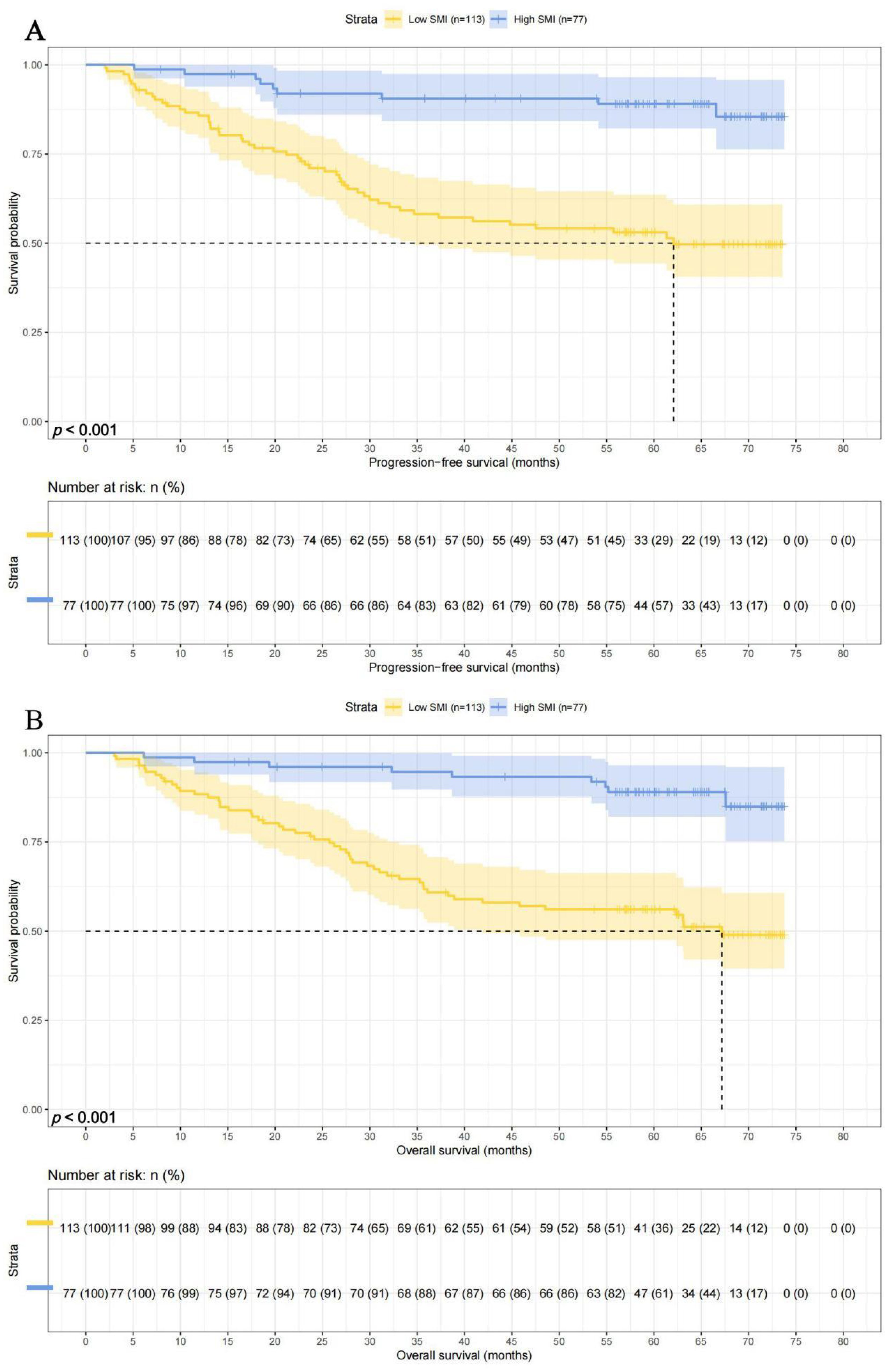 There were 113 patients with lower SMI, and their 1-, 3-, and 5-year survival rates for PFS and OS were 85.7% (95% CI: 79.5%-92.5%), 58.2% (95% CI: 49.5%-68.4%), and 53.1% (95% CI: 44.3%-63.6%) and 88.4% (95% CI: 82.6%-94.5%), 61.8% (95% CI: 53.3%-71.6%),and 51.6% (95% CI: 47.5%-66.3%), respectively. While there were 73 patients with higher SMI, and their 1-, 3-, and 5-year survival rates for PFS and OS were 97.4% (95% CI: 93.9%-100.0%), 90.6% (95% CI: 84.2%-97.5%), and 89.0% (95% CI: 82.1%-96.5%) and 97.4% (95% CI: 93.9%-100.0%), 94.7% (95% CI: 89.7%-99.9%), and 89.0% (95% CI: 82.1%-96.5%), respectively. Patients with high SMI levels had longer PFS (HR = 0.196, p < 0.001) and OS (HR = 0.195, p < 0.001) (Figures 3A, B).