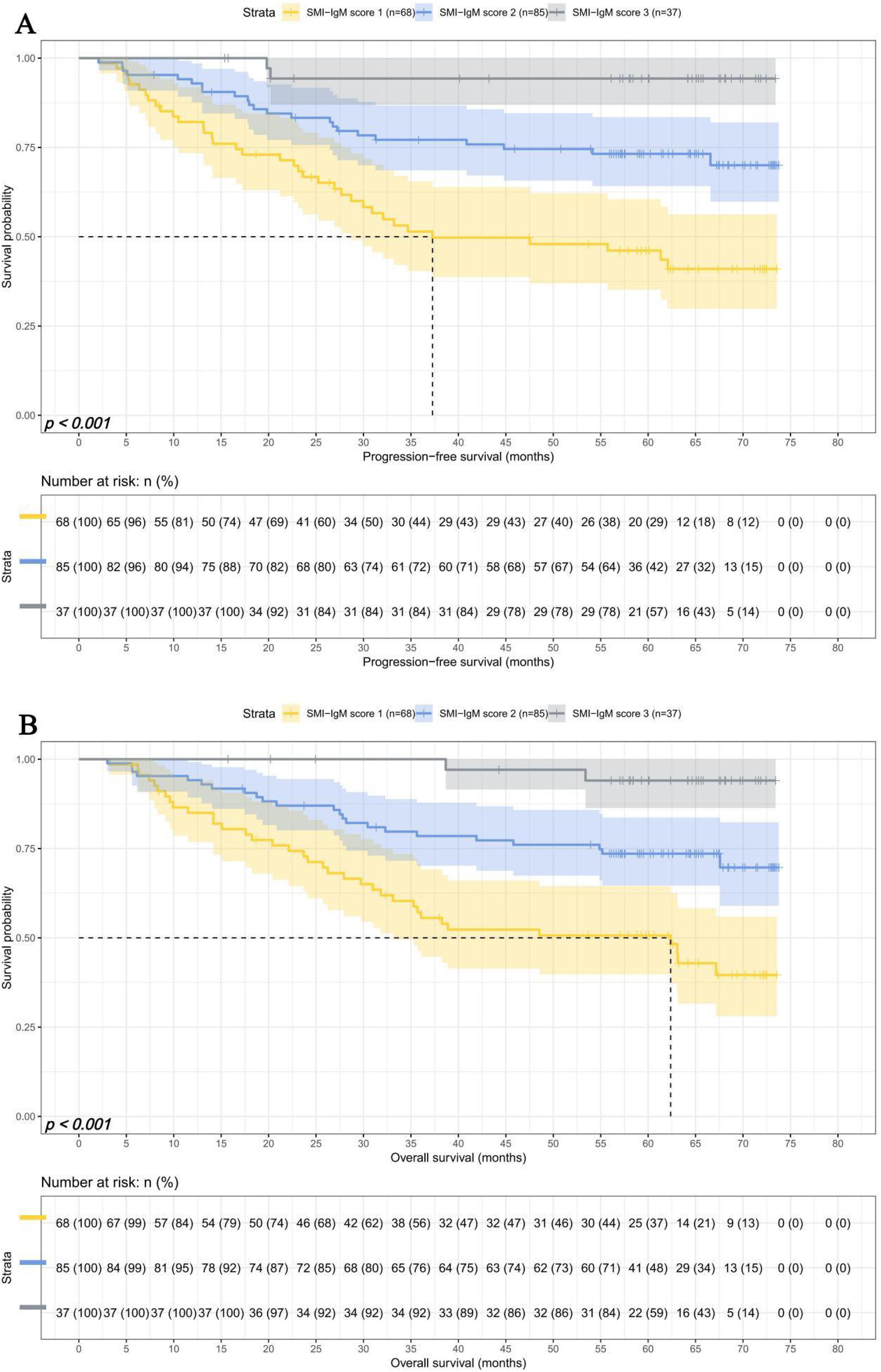 Results: There were 68 patients (35.8%) in the SMI-IgM 1 group, 85 patients (44.7%) in the SMI-IgM 2 group, and 37 patients (19.5%) in the SMI-IgM 3 group. Patients in the SMI-IgM 1 group had worse PFS (HR = 0.345, 95% CI: 0.226-0.525, p < 0.001) and OS (HR = 0.345, 95% CI: 0.227-0.525, p < 0.001). The multifactorial analysis showed that SMI-IgM score was an independent predictor of PFS and OS in patients. The calibration curves show better predictive efficacy of the column charts in years 3 and 5.