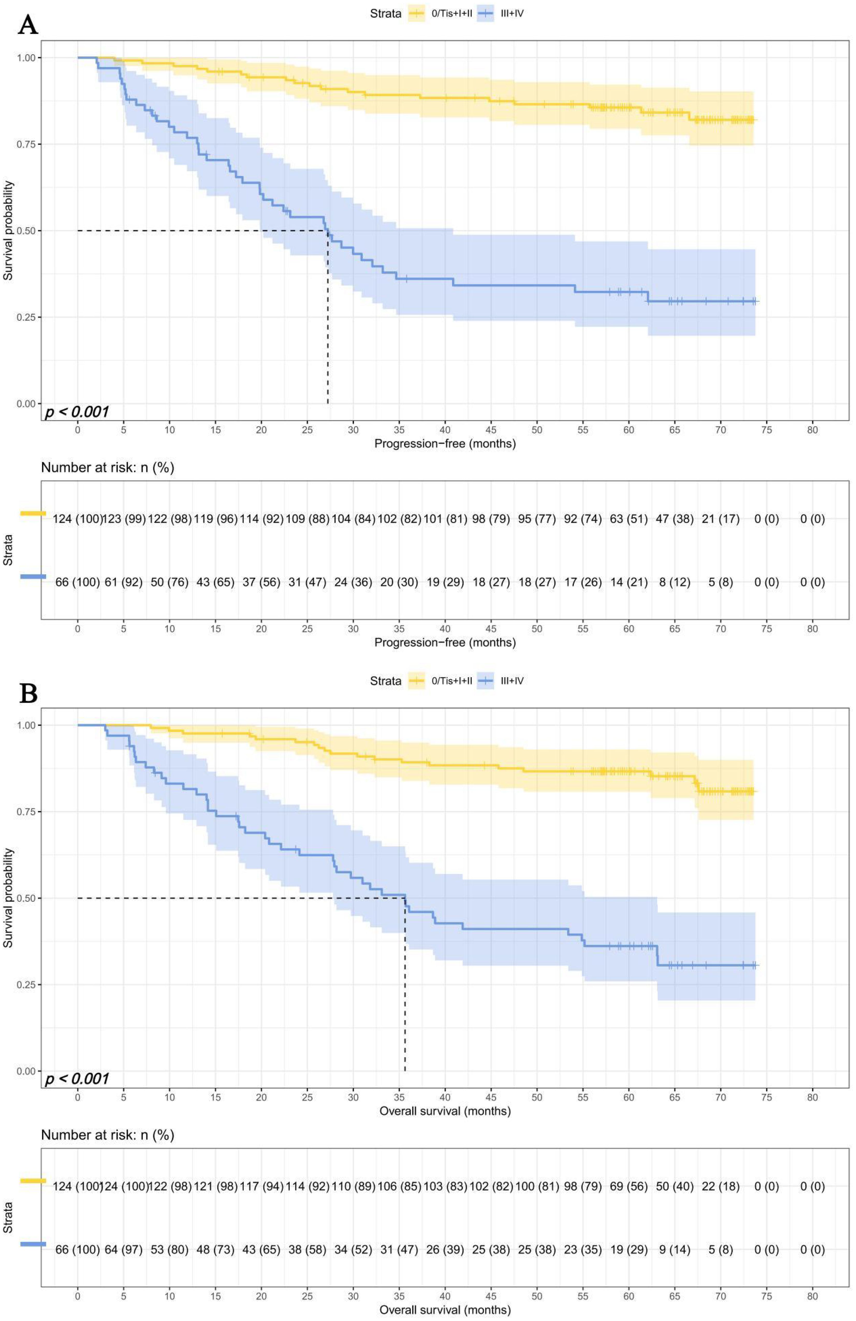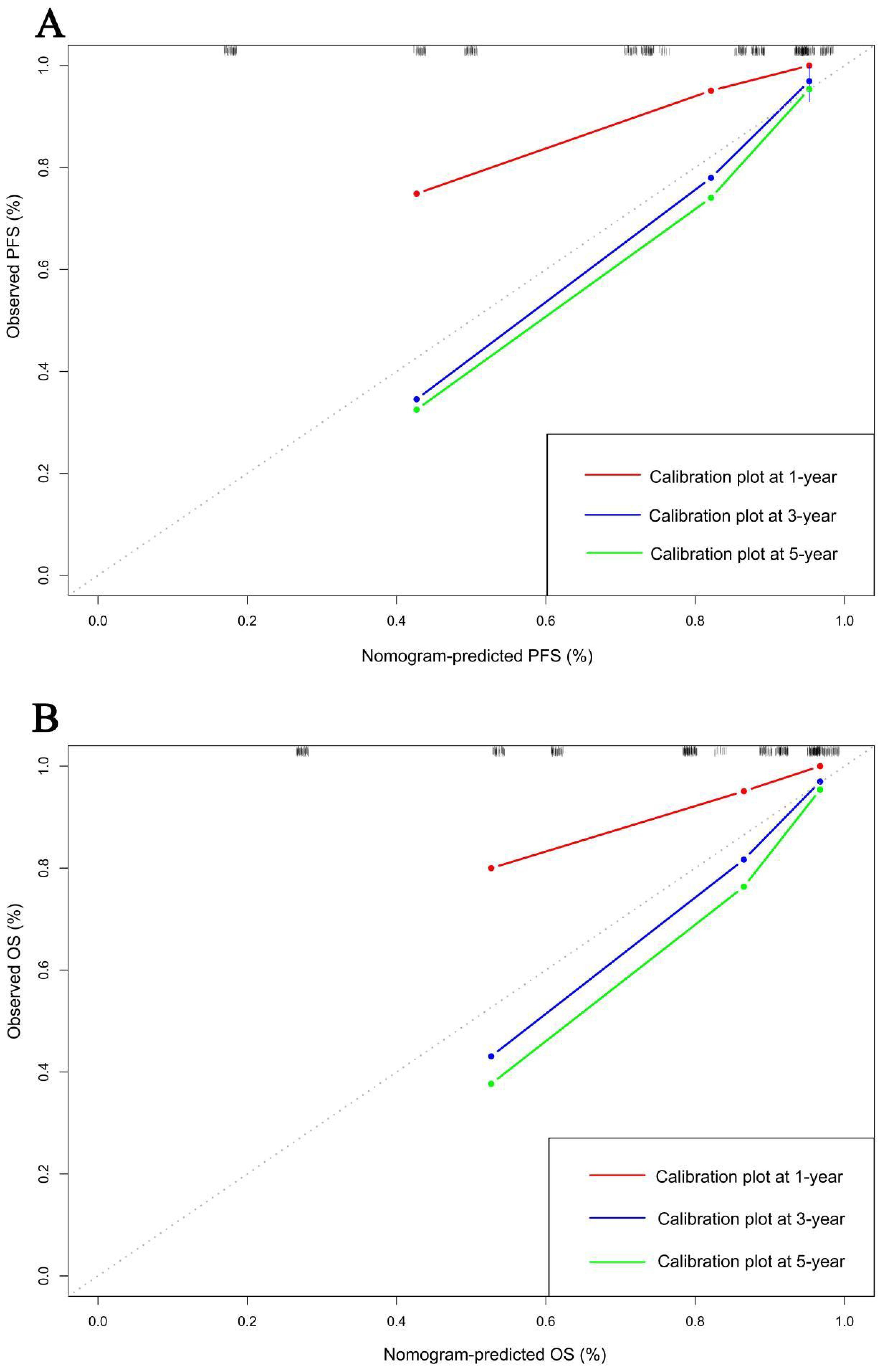We use mean with standard deviation (SD) or median with interquartile range (IQR) to represent continuous variables. Use percentages to represent categorical variables. We compared the differences between continuous variables using one-way ANOVA and Kruskal-Wallis rank-sum test. The differences between categorical variables are compared using chi square test or Fisher’s exact test. We used Kaplan-Meier survival curve and log-rank test to calculate the difference in survival rate and survival time. Univariate and multivariate analyses were conducted using the Cox proportional risk model. Variables with p < 0.05 in univariate analysis were input into multivariate Cox regression analysis. We further evaluated potential multicollinearity by calculating variance inflation factors (VIFs). We evaluate relative risk through hazard ratio (HR) and 95% confidence interval (CI). We constructed a nomogram to predict the 1-year, 3-year, and 5-year survival probabilities of PFS and OS. Calibration curve analysis is used to evaluate the prognostic predictive ability of nomograms. Finally, there is a statistically significant difference in p values < 0.05 between the two sides.