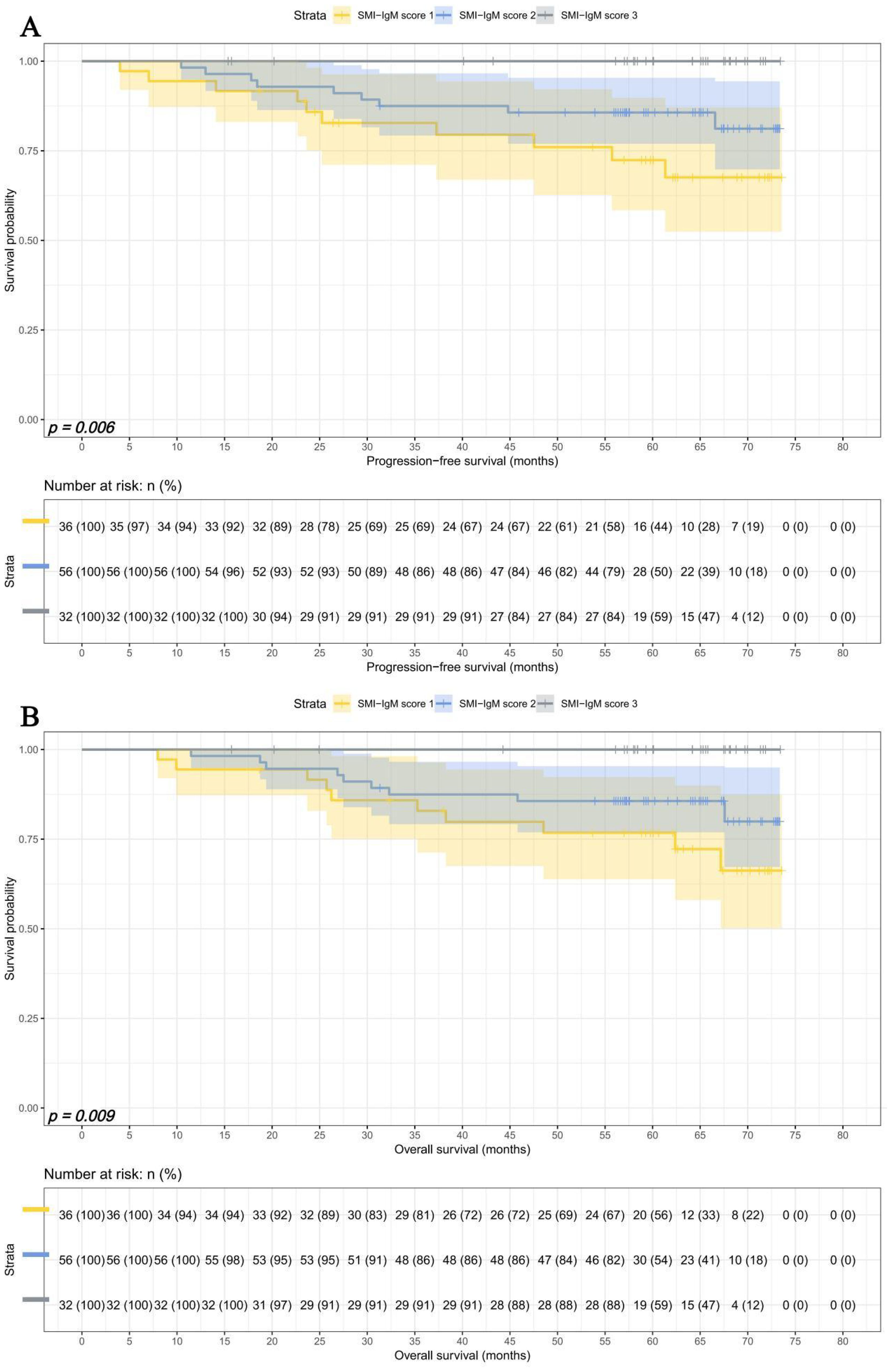 The median survival times for PFS and OS in SMI-IgM score 1 group were 37.27 months and 62.37 months. The 1-, 3-, and 5- year survival rates for PFS in SMI-IgM score 1 group were 82.1% (95% CI: 73.4%-91.8%), 51.4% (95% CI: 40.4%-65.5%), 46.1% (95% CI: 35.1%-60.5%). The 1-, 3-, and 5- year survival rates for OS in SMI-IgM score 1 were 85.0% (95% CI: 76.8%-94.0%), 57.2% (95% CI: 46.3%-70.6%), 50.7% (95% CI: 39.8%-64.5%). The median survival time of PFS in SMI-IgM score groups 2 and 3 were both not achieved. The 1-, 3-, and 5-year survival rates for PFS in SMI-IgM score groups 2 and 3 were 92.9% (95% CI: 87.6%-98.5%), 77.1% (95% CI: 68.6%-86.7%), and 73.2% (95% CI: 64.2%-83.5%); 100.0% (95% CI: 100.0%-100.0%), 94.3% (95% CI: 86.9%-100.0%), and 94.3% (95% CI: 86.9%-100.0%), respectively. The median survival time of OS in SMI-IgM score groups 2 and 3 were not achieved. The 1-, 3-, and 5-year survival rates for OS in SMI-IgM score groups 2 and 3 were 94.1% (95% CI: 89.2%-99.3%), 78.5% (95% CI: 70.2%-87.8%), and 73.6% (95% CI: 64.6%-83.7%); 100.0% (95% CI: 100.0%-100.0%), 100.0% (95% CI: 100.0%-100.0%), and 94.0% (95% CI: 86.3%-100.0%), respectively. Patients with SMI-IgM score 1 had worse PFS (HR = 0.345, 95% CI: 0.226-0.525, p < 0.001) and OS (HR = 0.345, 95% CI: 0.227-0.525, p < 0.001) (Figures 4A, B).
