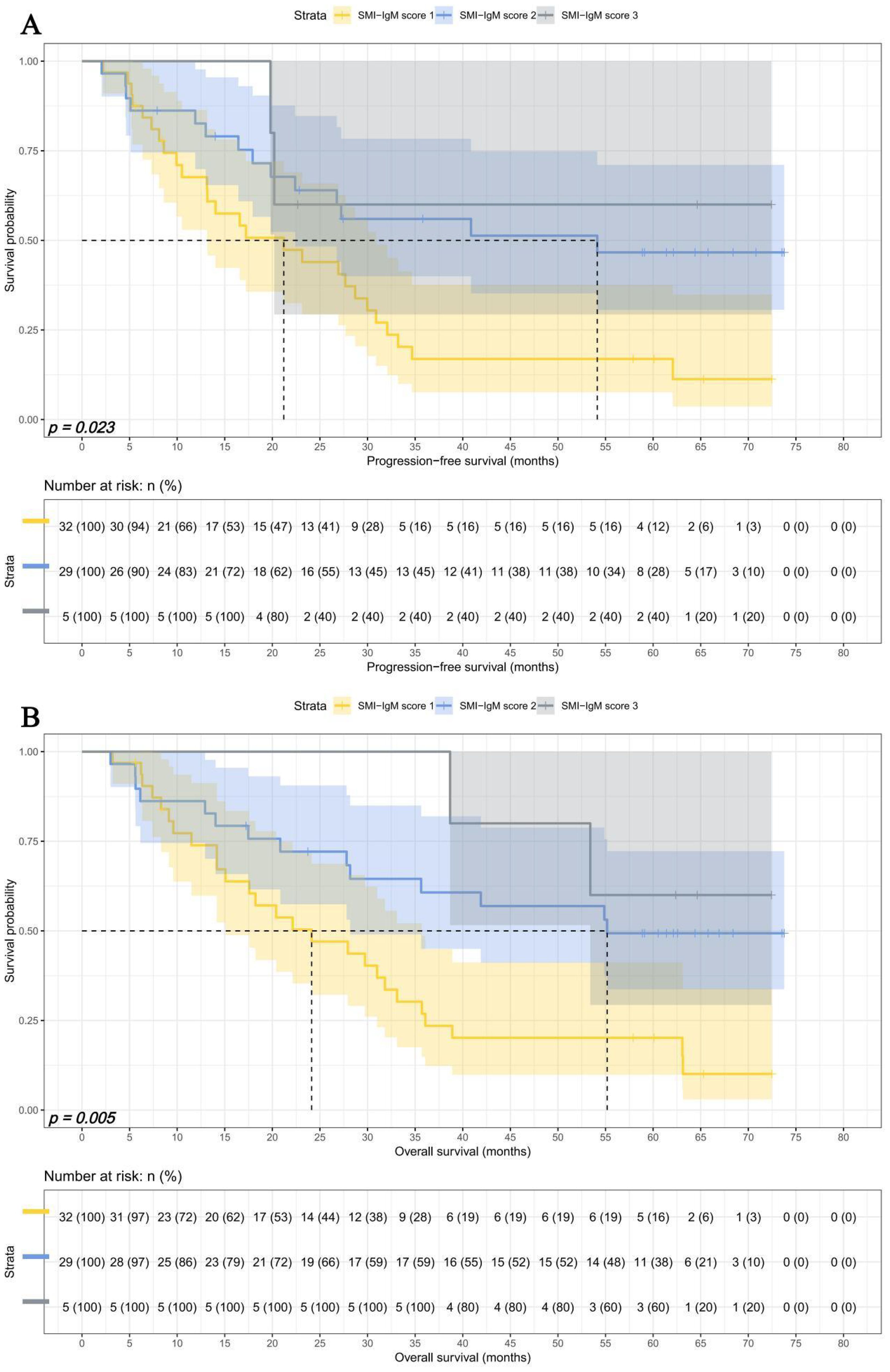 In advanced pTNM stage, There were 32 patients in SMI-IgM score 1 group, 29 patients in SMI-IgM score 2 group, and 5 patients in SMI-IgM score 3 group. The 1-, 3-, and 5-year survival rates for PFS and OS in SMI-IgM score 1 were 67.6% (95% CI: 52.9%-86.4%) vs. 73.9% (95% CI: 59.8%-91.2%), 16.9% (95% CI: 7.6%-37.5%) vs.26.9% (95% CI: 14.9%-48.5%), and 16.9% (95% CI: 7.6%-37.5%) vs. 20.2% (95% CI: 9.9%-41.2%). The 1-, 3-, and 5-year survival rates for PFS and OS in SMI-IgM score 2 were 82.6% (95% CI: 69.9%-97.7%), 56.0% (95% CI: 40.0%-78.3%), and 46.6% (95% CI: 30.6%-71.1%); 86.2% (95% CI: 74.5%-99.7%), 60.7% (95% CI: 45.0%-81.9%), and 49.3% (95% CI: 33.7%-72.2%), respectively. The 1-, 3-, and 5-year survival rates for PFS and OS in SMI-IgM score 3 were 100.0% (95% CI: 100.0%-100.0%) vs. 100.0% (95% CI: 100.0%-100.0%), 60.0% (95% CI: 29.3%-100.0%) vs. 100.0% (95% CI: 100.0%-100.0%), and 60.0% (95% CI: 29.3%-100.0%) vs. 60.0% (95% CI: 29.3%-100.0%). Patients with SMI-IgM score 1 had worse PFS (HR = 0.491, 95% CI: 0.284-0.850, p = 0.011) and OS (HR = 0.434, 95% CI: 0.252-0.746, p = 0.003) (Figures 7A, B).