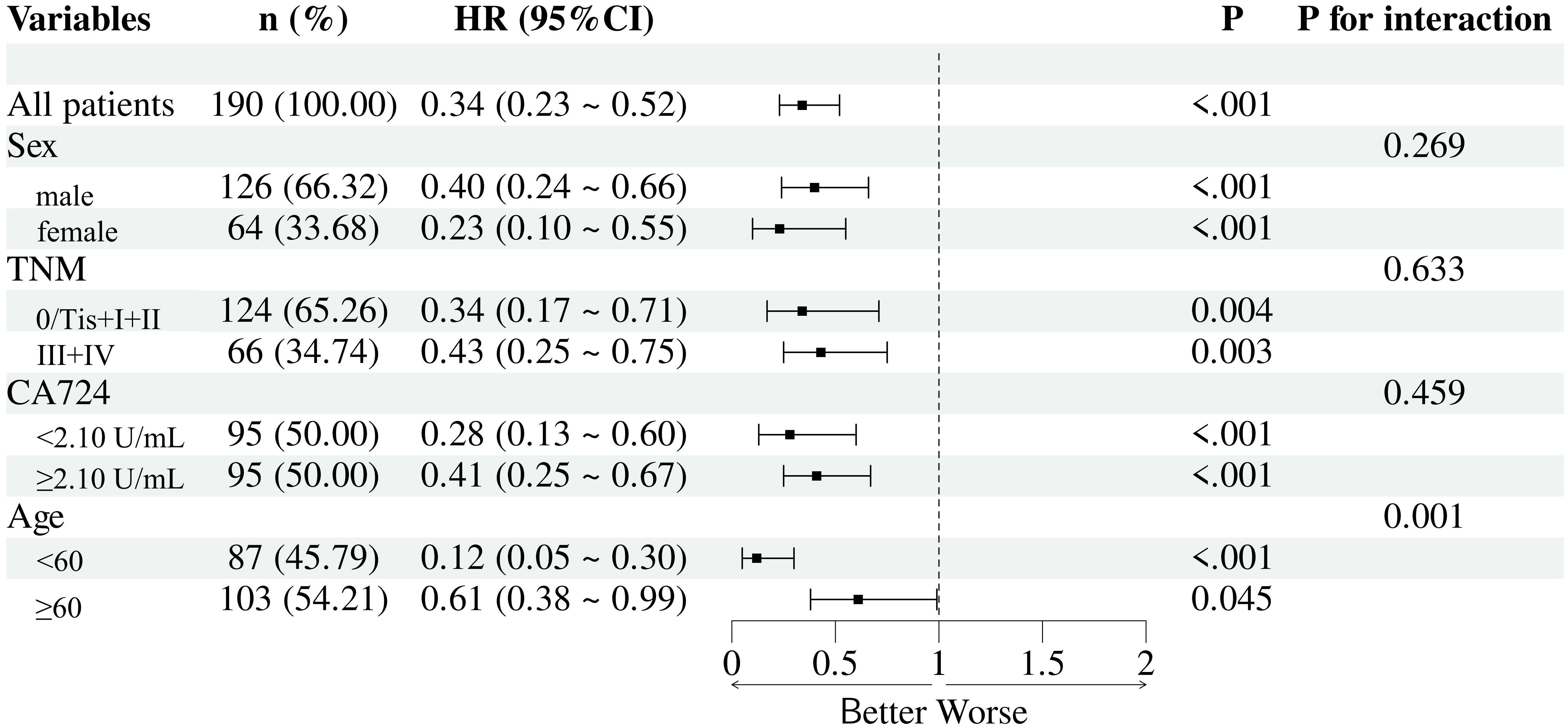 Subgroup analyses were conducted to assess the prognostic value of the SMI-IgM across different clinical strata, including sex, TNM stage, CA724 level, and age. The SMI-IgM remained a significant predictor of overall survival in most subgroups, with no significant interactions observed for sex, TNM stage, or CA724 level. Notably, a significant interaction was detected for age, indicating that the prognostic impact of the SMI-IgM index was more pronounced in younger patients (Figure 8).