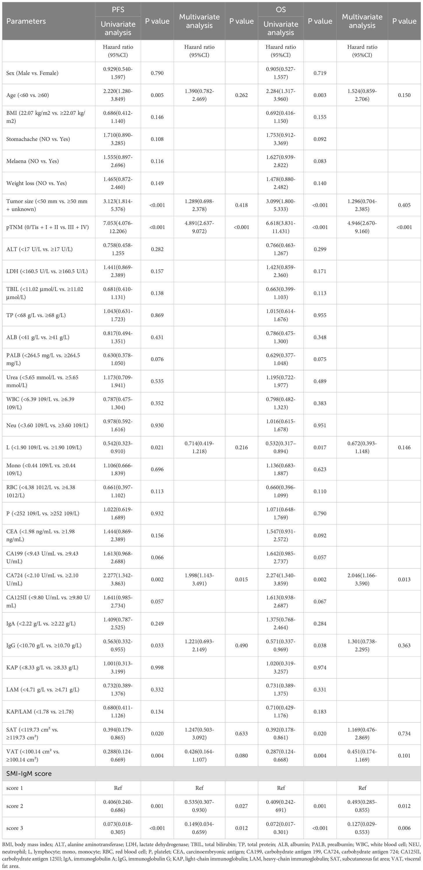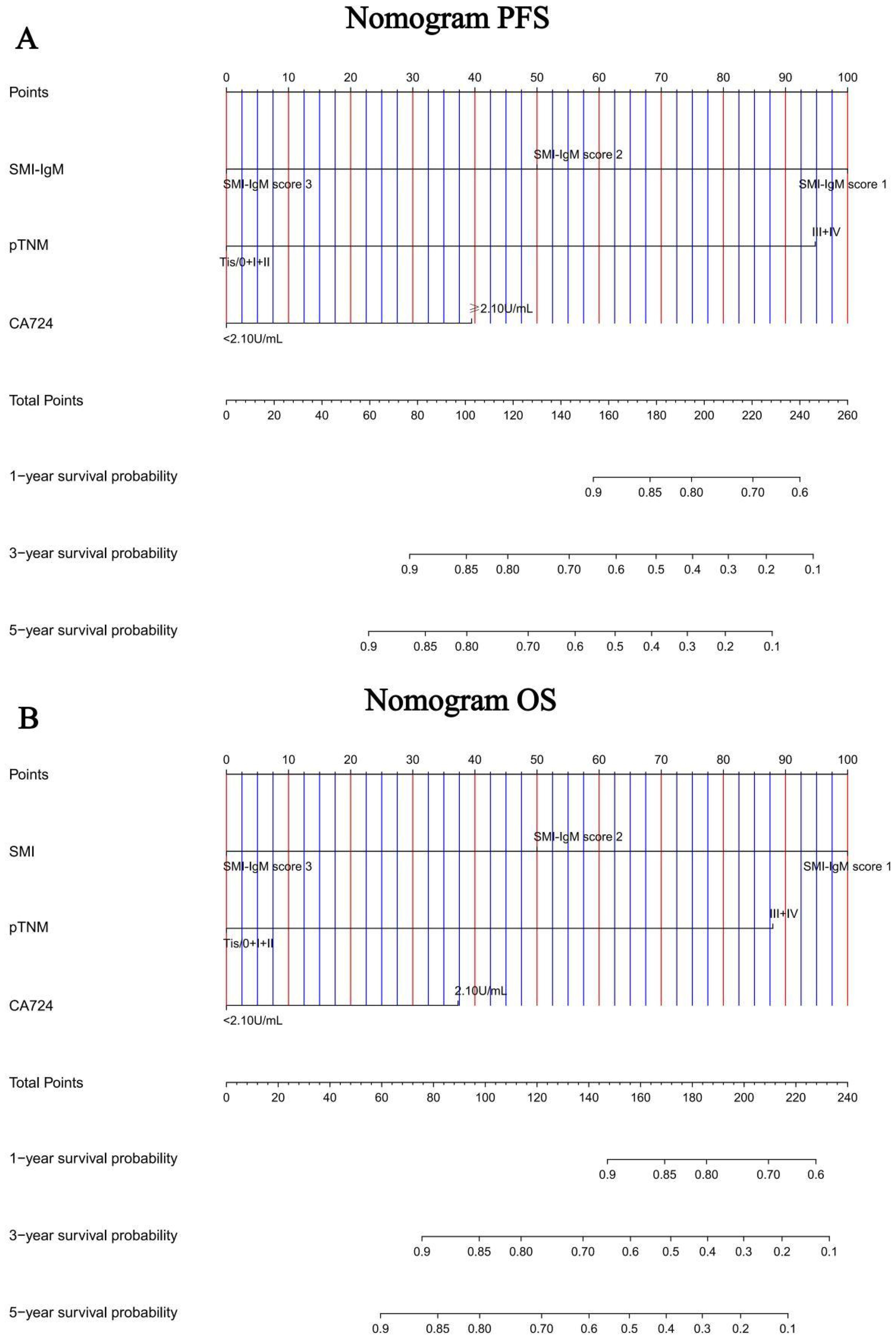 The univariate analysis found the patients’ age (p = 0.005), tumor size (p < 0.001), pTNM stage (p < 0.001), L (p = 0.021), CA724 (p = 0.002), IgG (p = 0.033), SAT (p = 0.020), VAT (p = 0.004), SMI-IgM score (p < 0.001) were related to PFS. Our research indicates that the prognostic factors for patients with OS were age (p = 0.003), L (p = 0.017), tumor size (p < 0.001), pTNM stage (p < 0.001), CA724 (p = 0.002), IgG (p = 0.038), SAT (p = 0.020), VAT (p = 0.004), SMI-IgM score (p < 0.001). The multivariate analysis indicated that CA724 (p = 0.015), pTNM stage (p < 0.001), and SMI-IgM score (p < 0.05) were independent prognostic factors for PFS. Our research findings suggest that the prognostic factors for patient OS were CA724 (p = 0.013), pTNM stage (p < 0.001), and SMI-IgM score (p < 0.05) (Table 2). We additionally performed supplementary analyses in which SMI and IgM were treated as continuous variables. In the univariate Cox regression analysis, SMI was significantly associated with both PFS (HR = 0.958, p = 0.014) and OS (HR = 0.960, p = 0.017), whereas IgM showed no significant association with PFS (HR = 0.580, p = 0.098) or OS (HR = 0.579, p = 0.098). We further assessed multicollinearity among the included predictors by calculating variance inflation factors (VIFs) (all <5), indicating no significant collinearity.