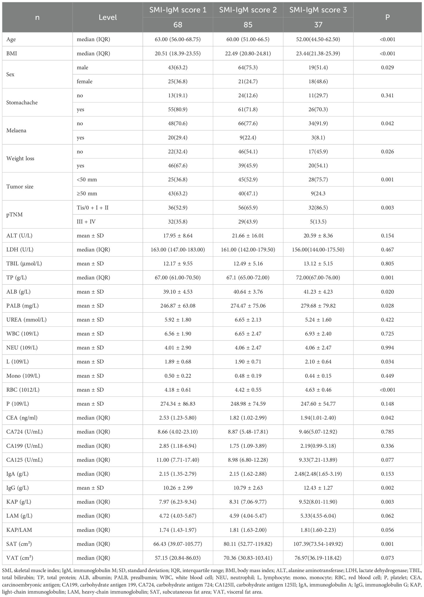 This study continuously enrolled 190 patients, with a median age of 60 years old, consisting of 126 males (66.3%) and 64 females (33.7%). We found through chi square test or Fisher’s exact test that the SMI-IgM score was associated with Melena (p = 0.042), weight loss (p = 0.026), tumor size (p = 0.001), and pTNM staging (p = 0.003). The one-way ANOVA and Kruskal-Wails rank sum test showed that SMI-IgM score was related to age, body mass index (BMI), and SAT (all p < 0.05). Table 1 shows the clinical characteristics of patients grouped by SMI-IgM score.