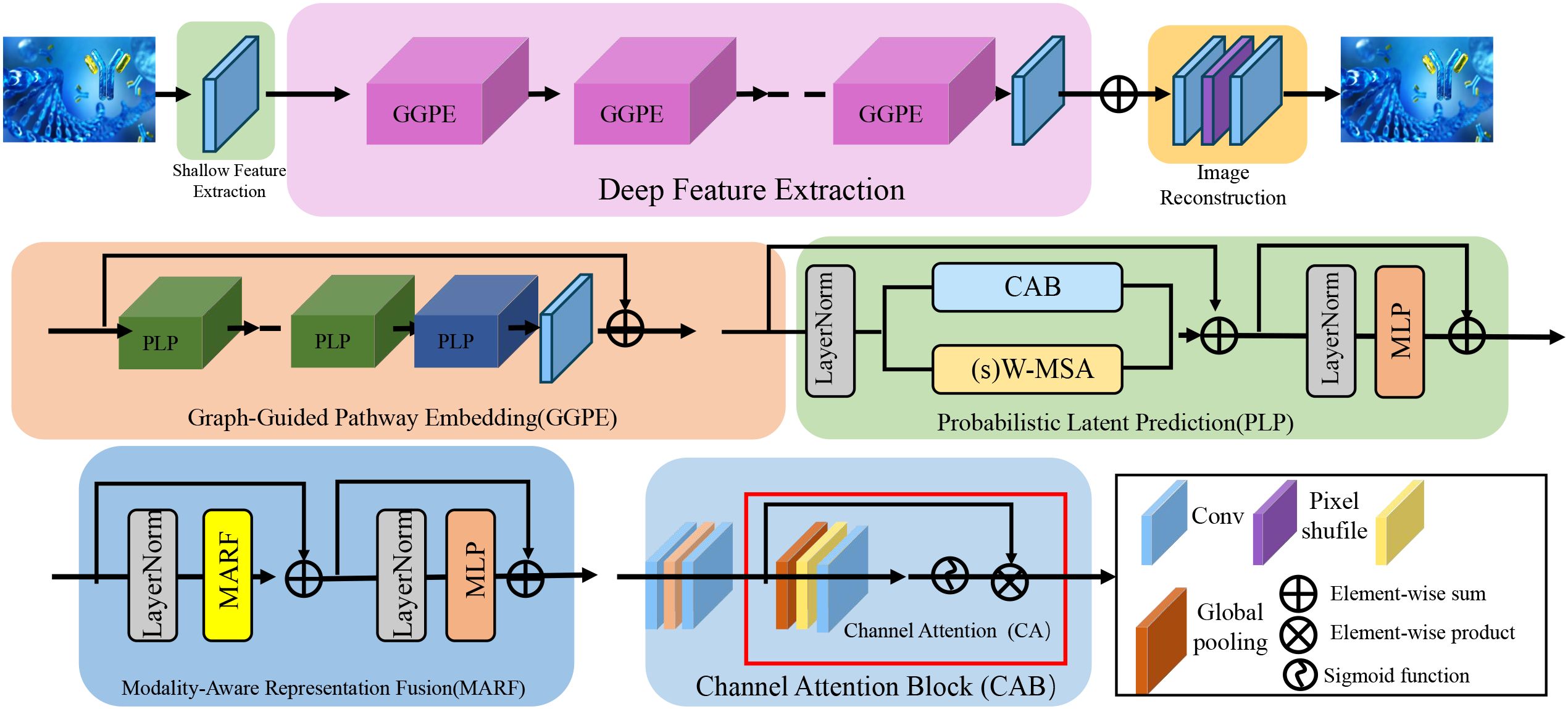 Figure 1. Illustration of the BioGraphAI architecture. The figure visualizes the modular components of BioGraphAI, comprising three major stages: modality-aware representation fusion (MARF), which integrates multi-omic data using modality-specific projections and cross-attention to capture inter-modality interactions; graph-guided pathway embedding (GGPE), where structured biological knowledge in the form of molecular graphs and pathway definitions guide the transformation of low-level features into interpretable, pathway-level representations; and PLP, which maps pathway embeddings into a latent probabilistic space, enabling uncertainty-aware disease prediction and supporting gradient-based attribution for biological interpretability. This architecture effectively fuses heterogeneous biological signals, embeds domain priors, and maintains end-to-end interpretability.