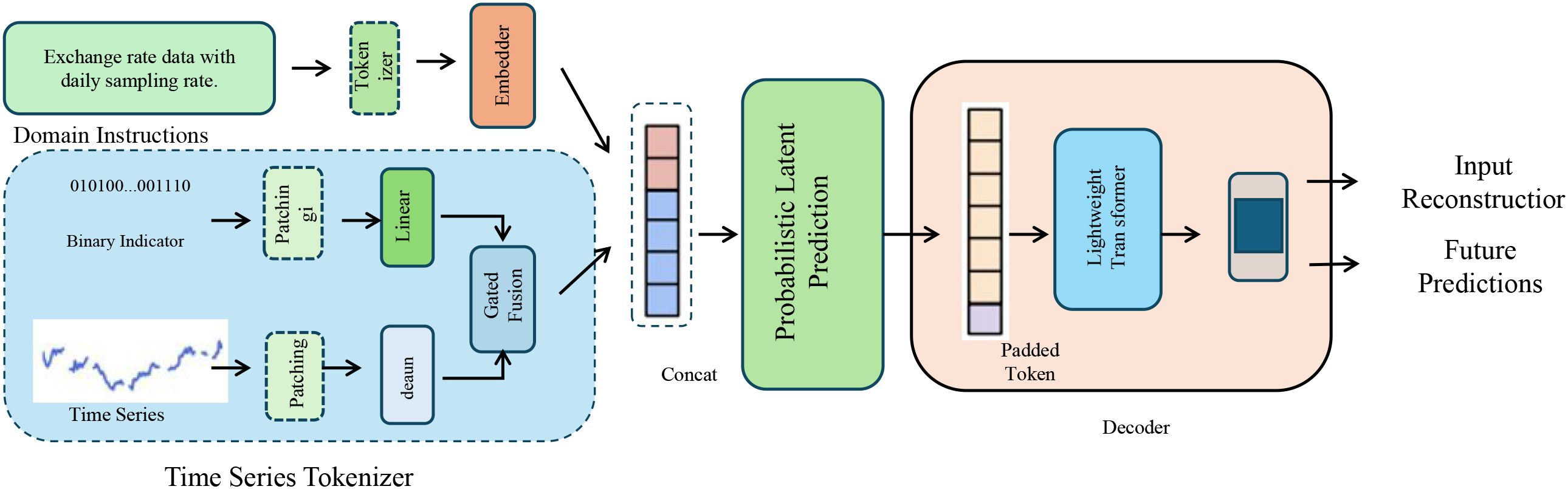 Figure 2. Illustration of probabilistic latent prediction. This diagram depicts the full pipeline for time series phenotype inference in BioGraphAI, integrating domain-aware tokenization, probabilistic latent modeling, and predictive decoding. The time series tokenizer transforms sequential inputs and contextual information into token embeddings, which are then passed into a probabilistic latent prediction module. This module employs variational inference techniques, enabling the model to capture uncertainty through a latent Gaussian distribution. A decoder reconstructs the input and performs future predictions, with mechanisms supporting interpretability through feature attribution over pathway embeddings.
