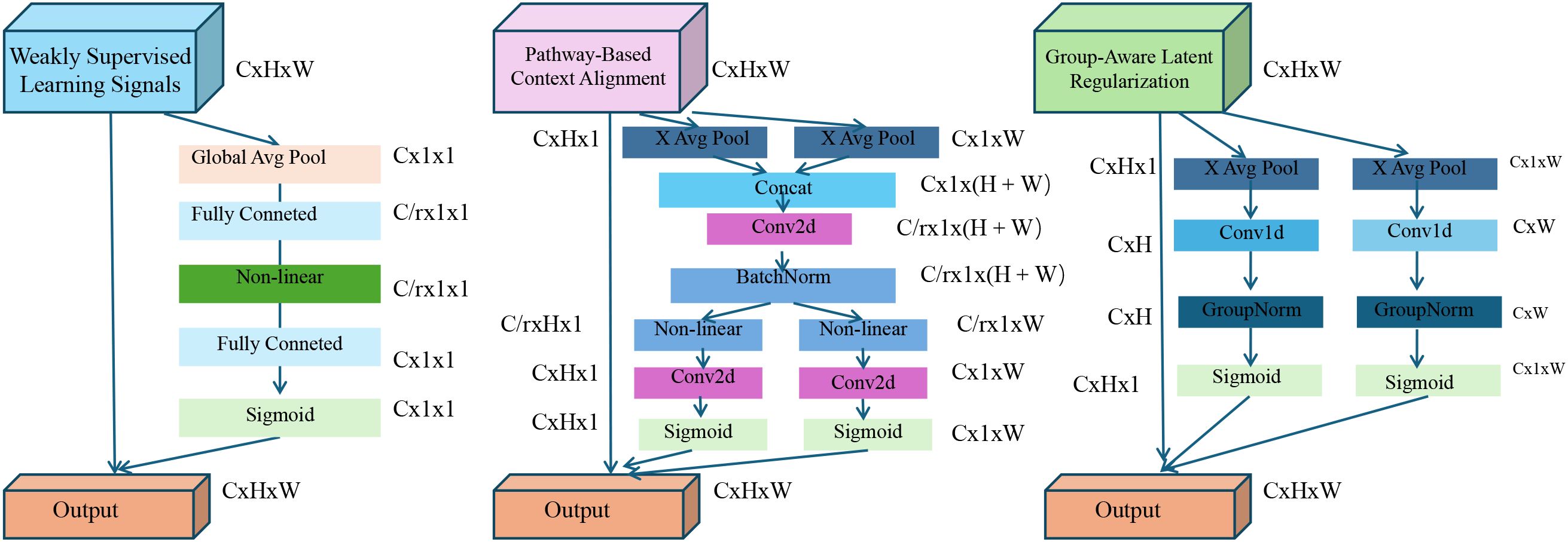 Figure 3. Overview of the adaptive contextual knowledge regularization (ACKR). The figure illustrates the three key components of ACKR: weakly supervised learning signals, pathway-based context alignment, and group-aware latent regularization. Each component introduces specific regularization flows—KL-divergence with entropy control, pathway-guided projection with consistency loss, and group-driven intra-/inter-cluster constraints—to guide the model towards biologically grounded and robust latent representations. These mechanisms are integrated into the model’s training pipeline to enable interpretability, noise resilience, and structured generalization across heterogeneous patient populations.