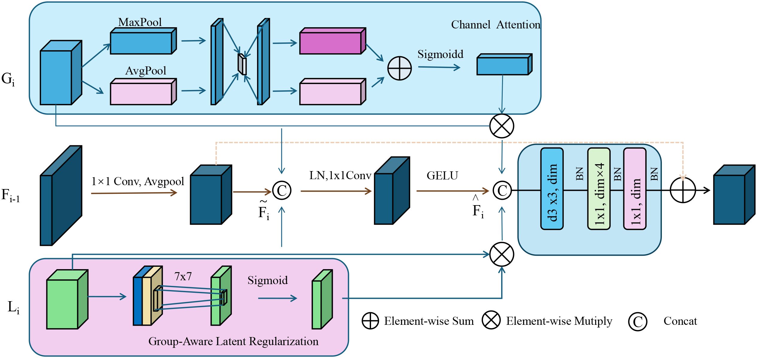 Figure 4. Group-aware latent regularization illustration. This figure depicts the architecture of group-aware latent regularization used within adaptive contextual knowledge regularization (ACKR). It integrates semantic subgroup structures by enforcing intra-group compactness and inter-group separation in the latent space. Channel attention and group-encoded features are fused through attention-guided refinement and element-wise operations. A 7 × 7 convolution followed by a sigmoid activation modulates the group-specific latent cues, which are then combined with contextual and attention-enhanced embeddings. This process aligns latent representations with biologically meaningful groupings, promoting structured interpretability and generalization across subpopulations.