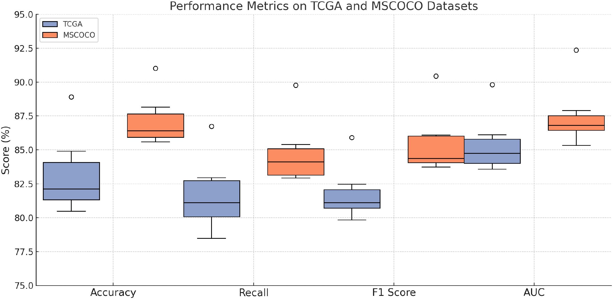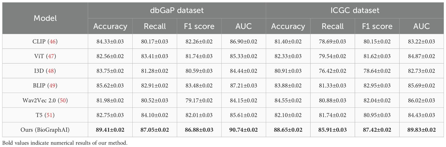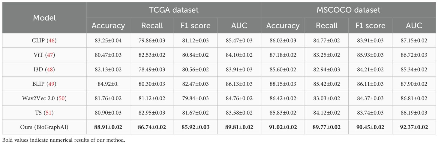 We compare our proposed BioGraphAI model with several state-of-the-art (SOTA) approaches on four benchmark datasets: TCGA,GTEx, dbGaP, and ICGC. The results are comprehensively presented in Tables 1, 2. On the TCGA dataset, BioGraphAI achieves an impressive accuracy of 88.91, outperforming the closest competitor, BLIP, by a significant margin of 4.0 points. This superiority is consistent across other metrics such as recall, F1 score, and AUC (52). The results on the GTEx dataset further affirm this trend, where BioGraphAI scores 91.02 in accuracy and 92.37 in AUC, again clearly surpassing other approaches. Compared with CLIP and ViT, which rely on image-text alignment without deep modality integration, BioGraphAI benefits from its deeper cross-modal attention and dynamic fusion strategy, yielding improvements especially in semantic precision as shown in the higher F1 values. Notably, even compared to BLIP, which combines vision-language pretraining and retrieval-augmented generation, BioGraphAI still provides a robust advantage, suggesting that our dynamic memory integration contributes significantly to performance.