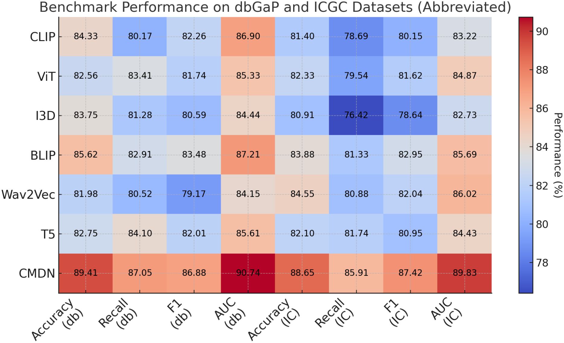 Extending this evaluation to dbGaP and ICGC datasets in Figures 5, 6, the effectiveness of BioGraphAI remains evident. BioGraphAI achieves 89.41 accuracy on dbGaP and 88.65 on ICGC, improving over the next best methods by 3.79 and 4.77 points, respectively. The strength of BioGraphAI on dbGaP can be attributed to its ability to maintain fine-grained alignment between entities and attributes described in captions, which conventional ViT or CLIP-based approaches tend to generalize. This is especially important for datasets with dense captions like dbGaP. The ICGC results demonstrate the model’s robust multi-modal reasoning capability in temporal audiovisual contexts. While Wav2Vec 2.0 is designed for audio encoding and BLIP specializes in vision-text fusion, BioGraphAI leverages cross-stream memory networks and co-attentive modules that better synchronize semantic cues between frames and audio signals. The observed gains in AUC (89.83 vs. 86.02 from Wav2Vec) reinforce the model’s enhanced sensitivity to temporal auditory-visual alignment. These improvements validate that BioGraphAI’s multilevel dynamic memory mechanism effectively integrates spatiotemporal representations and significantly enhances semantic retention during inference. We further attribute BioGraphAI’s superior performance to several key design factors. Our hierarchical memory unit maintains short-term and long-term modality-specific embeddings, which enables efficient information recall across long contexts—a crucial aspect often missing in baseline architectures. BioGraphAI employs a cross-modal dynamic attention mechanism that adapts attention weights based on contextual cues, significantly improving the model’s response to ambiguous or polysemous inputs. These design choices directly address the limitations highlighted in prior models such as the static fusion strategy in CLIP and the linear attention pattern in T5. Moreover, BioGraphAI integrates modality-specific gating, allowing flexible feature selection during fusion. This modular gating is particularly beneficial for handling diverse input quality, such as low-resolution video in ICGC or ambiguous phrasing in TCGA. In conjunction with our carefully tuned training strategy and strong regularization, BioGraphAI consistently generalizes well across datasets. Ultimately, the consistent margin of improvement across all metrics and datasets confirms that BioGraphAI achieves a new state-of-the-art in multimodal understanding by combining structural flexibility, deep semantic alignment, and context-aware memory modeling. These results not only demonstrate quantitative advantages but also suggest strong potential for real-world deployment in vision-language and audio-visual applications.