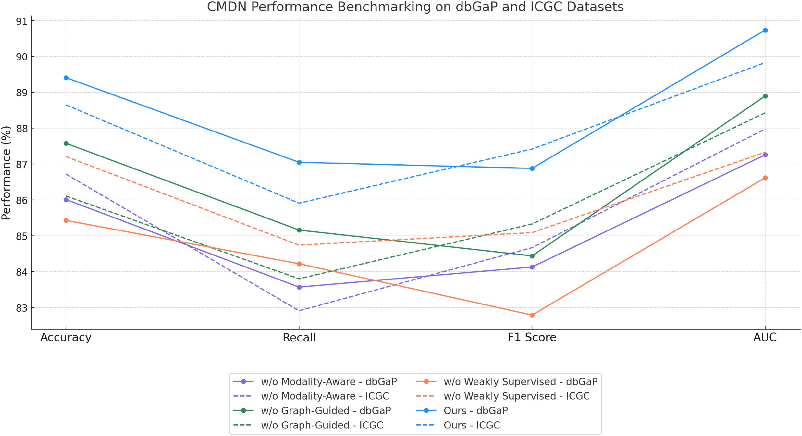dbGaP and ICGC results further reinforce these findings in Figures 7, 8. Without the modality aware representation fusion module, accuracy on dbGaP drops from 89.41 to 86.01 and on ICGC from 88.65 to 86.72. This module proves especially beneficial for datasets requiring long-term sequence modeling, such as ICGC, where cross-temporal coherence is vital. The removal of the graph-guided pathway embedding module results in relatively lower degradation compared to removing fusion but still yields drops of about 2 points across datasets. Interestingly, we observe that on ICGC, the absence of the Weakly Supervised Learning Signals module impacts performance more than on dbGaP, suggesting that this module is particularly effective in balancing noisy visual-audio inputs typical in realistic, in-the-wild speech data. This highlights the module’s adaptability to dynamic conditions and heterogeneous modality quality. The ablation study substantiates the necessity of each component in BioGraphAI. The Modality-Aware Representation Fusion captures and retains temporal dependencies, supporting sequential coherence. The graph-guided pathway embedding module allows the model to prioritize cross-modal cues adaptively, enhancing semantic integration, while the weakly supervised learning signals provides controlled fusion tailored to each task’s input signal quality. Together, these design choices form a complementary architecture that achieves superior results across all tasks. Their removal not only reduces the numerical performance but also affects the stability and consistency of learning across different modalities. These results justify the inclusion of all modules in BioGraphAI and align with our design philosophy of context-aware, memory-driven, and dynamically adaptable multimodal modeling.