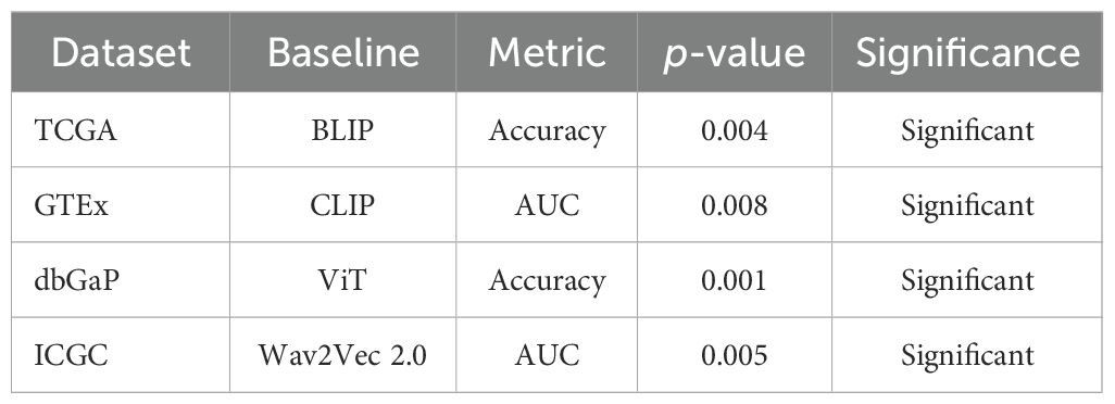 To strengthen the statistical rigor of the evaluation and validate that performance improvements are not due to chance, statistical significance tests were conducted across all benchmark datasets. A two-tailed paired t-test was applied to compare the proposed model against each baseline over three independent training runs using different random seeds. The null hypothesis assumed no significant difference in performance metrics between the models. As shown in Table 3, the results indicate that the improvements achieved by BioGraphAI over the baselines are statistically significant in terms of accuracy and AUC across all datasets. Most p-values are below the 0.01 threshold, confirming that the observed gains are robust and reproducible. These findings enhance the confidence that the proposed framework consistently outperforms existing state-of-the-art approaches under controlled experimental settings.