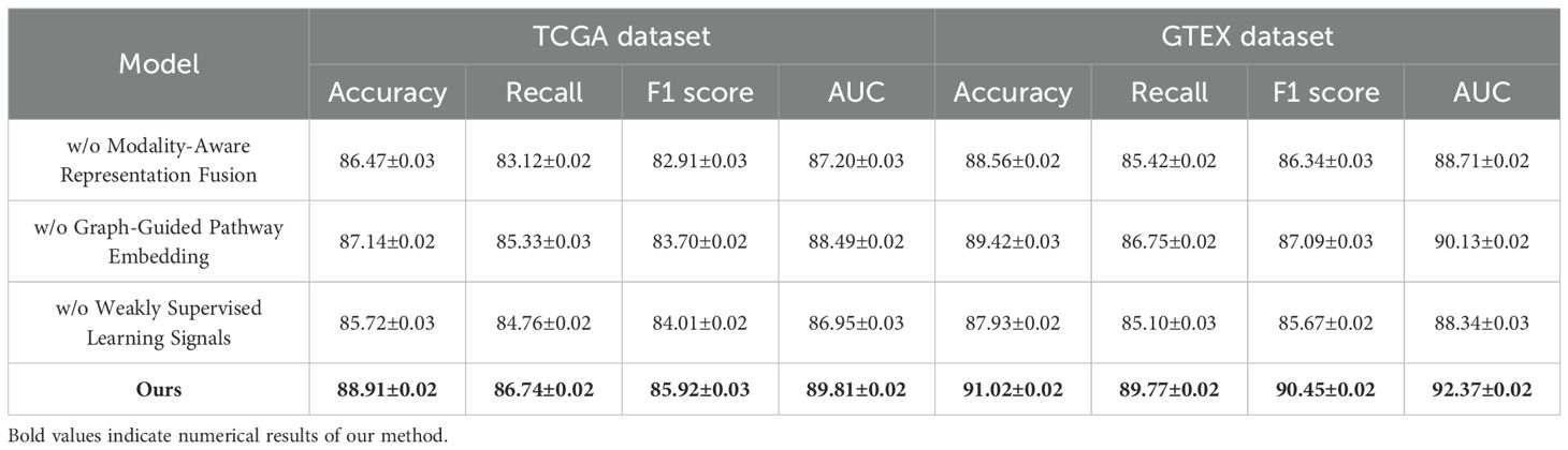 In Tables 4, 5, we remove each key module independently and assess its impact on performance. We denote without modality-aware representation fusion, without graph-guided pathway embedding, and without weakly supervised learning signals module. Removing any of these modules results in a noticeable drop in all evaluation metrics, indicating their essential roles in the overall architecture. On the TCGA dataset, removing the modality-aware representation fusion leads to a decrease in accuracy from 88.91 to 86.47, and F1 score drops from 85.92 to 82.91. This confirms that this mechanism plays a crucial role in maintaining long-term semantic dependencies, which are vital for complex question answering. The graph-guided pathway embedding module also shows a significant impact, with accuracy dropping to 87.14 and AUC reduced to 88.49. This module allows the model to recalibrate the attention focus depending on contextual modality signals, which is particularly beneficial in handling ambiguous visual-linguistic mappings. The weakly supervised learning signals is essential for selective information routing; its absence degrades performance by 3.19 points in accuracy and 1.91 in AUC on the GTEx dataset. Similar patterns are observed across all four metrics. Compared to the full BioGraphAI configuration, the variants consistently perform worse, demonstrating that each component contributes distinctly to the model’s effectiveness.