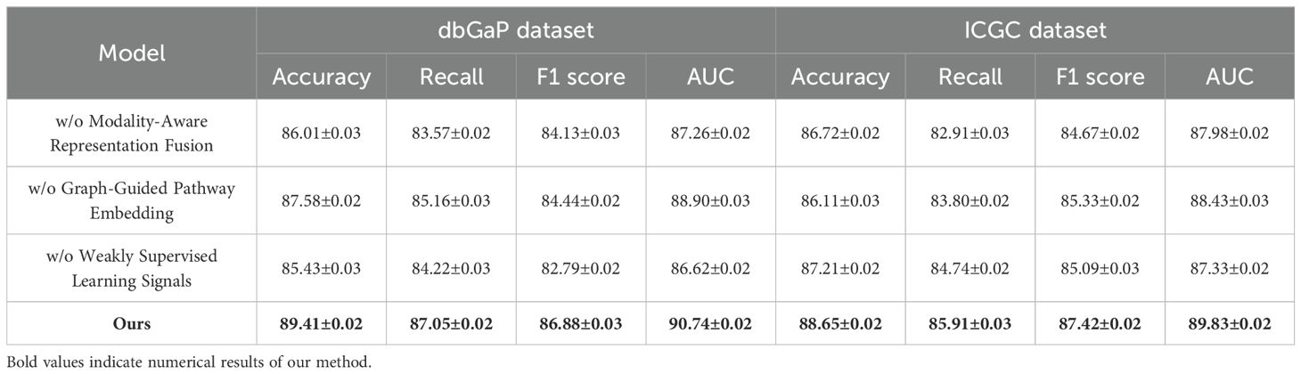 While the proposed framework incorporates curated biological pathway priors to enhance interpretability and align model behavior with established biomedical knowledge, it is not inherently dependent on the completeness of such databases. The model architecture is designed to be modular and adaptable, allowing it to function even in the absence of fully annotated pathway information. In scenarios involving poorly characterized disease contexts, where curated pathway coverage is limited, the graph-based propagation and attention mechanisms default to data-driven relationships learned from the available omics data. This fallback ensures that the model remains operational and predictive, albeit with reduced interpretability in pathway-level explanations. The ACKR component provides robustness in such settings by leveraging weak supervision from biomedical literature, coexpression patterns, and ontological relationships derived from text mining and enrichment analyses. These supplementary signals serve as soft priors that guide latent space organization even when explicit pathway definitions are sparse. The model also includes stochastic latent representations with uncertainty modeling, allowing it to quantify confidence in predictions, which is particularly useful when applied to novel disease subtypes. Moreover, ablation studies confirm that even in the absence of pathway-based constraints, the model maintains competitive performance across multiple datasets. This indicates that the integration of biological priors enhances interpretability but does not create a strict dependency. Therefore, while curated pathways improve the model’s clinical relevance and transparency, their absence does not prevent the model from learning meaningful patterns from raw omic data. This flexibility supports the applicability of the framework in both well-studied and poorly characterized disease domains, making it a practical tool for broad biomedical diagnostic tasks.