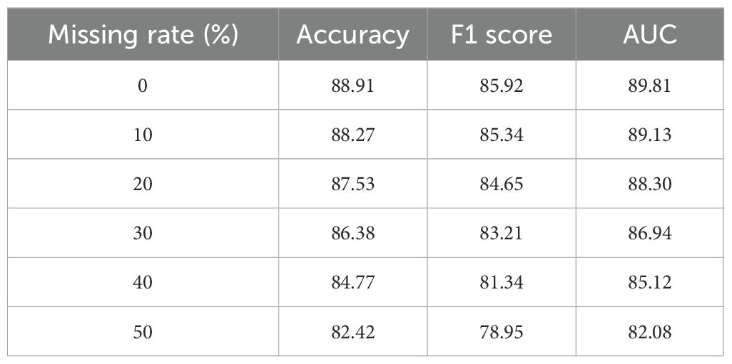 To further evaluate the robustness of BioGraphAI under conditions of incomplete data, we conducted a controlled study simulating varying levels of missingness in the input features. Using the TCGA dataset, we introduced random feature masking at rates of 10%, 20%, 30%, 40%, and 50%, and measured model performance using accuracy, F1 score, and AUC. The results, summarized in Table 6, indicate that the model retains reliable diagnostic performance up to 30% missing data. The AUC drops only marginally from 89.81 to 86.94 between 0% and 30% missingness. Even at 40% missingness, the model achieves an AUC of 85.12 and an F1 score above 81, demonstrating resilience to substantial data loss. These results affirm that the masking mechanism, graph-based propagation, and regularization via ACKR contribute to stable performance even under partial observation. Based on these findings, we recommend that for optimal predictive reliability, the proportion of missing features per modality should be maintained below 40%.