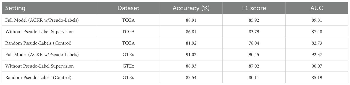 To further validate the role of pseudo-labeling within the ACKR module, we conducted an additional experiment focusing on its contribution to model performance. Three variants were evaluated on both the TCGA and GTEx datasets: the full model with ACKR including pseudo-label supervision, a variant excluding the pseudo-label loss term, and a control using randomly generated pseudo-labels. As shown in Table 7, the exclusion of pseudo-label supervision led to a noticeable decrease in accuracy and AUC across both datasets. For example, on TCGA, accuracy dropped from 88.91% to 86.81%, and AUC declined from 89.81 to 87.48. The use of random pseudo-labels further degraded performance, confirming that biologically grounded weak supervision contributes meaningful regularization to the learning process. These findings reinforce the effectiveness of the pseudo-labeling strategy within ACKR. Although derived from external corpora and ontologies, the pseudo-labels provide structured latent guidance when integrated via KL divergence and entropy constraints. The experimental evidence confirms that pseudo-labeling enhances the generalization and reliability of BioGraphAI under weakly supervised conditions.