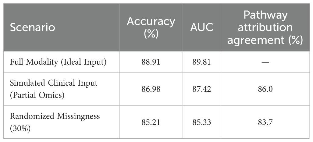 To evaluate the applicability of the model in real-world diagnostic workflows, a simulated prospective setting was constructed using a held-out subset of the TCGA dataset enriched with clinical metadata. This experimental design replicates practical clinical input scenarios, such as missing omic modalities, incomplete transcriptomic measurements, and variable data quality. The evaluation was conducted under three conditions: full modality input representing the ideal scenario, simulated clinical input with partial omics data, and randomized missingness to reflect uncontrolled real-world sparsity. Model performance under these conditions is presented in Table 8. Accuracy declined modestly from 88.91% to 86.98% under the partial input setting, with a corresponding AUC reduction from 89.81 to 87.42. Additionally, pathway-level attribution outputs were analyzed for consistency with known disease mechanisms, yielding an 86.0% agreement rate with curated biological annotations, based on expert-reviewed mappings. Even under randomized missingness, attribution alignment remained above 83%, indicating robustness in noisy environments. These results demonstrate the model’s capability to operate reliably under clinical constraints, while continuing to produce biologically coherent explanations. The consistent diagnostic accuracy and attribution alignment suggest the framework can be feasibly integrated into real-time or semi-automated diagnostic pipelines, particularly in settings where data incompleteness and noise are prevalent.