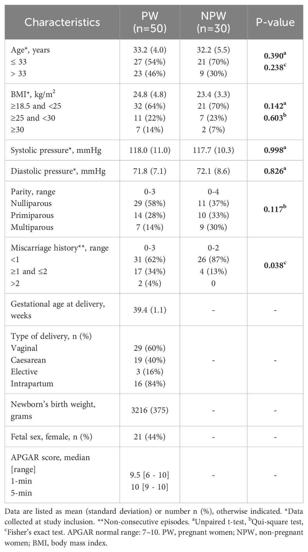 The mean age and BMI were similar between groups. In the pregnant group, 46% of the women were older than 33 years, whereas age distribution in the non-pregnant group was more evenly balanced, with approximately one-third in each age range. Regarding BMI, both groups primarily consisted of women with normal weight (18.5 to 24.9 kg/m2). Most women in both groups were nulliparous, however, the pregnant group had a higher frequency of women with one or more non-consecutive miscarriages. No additional significant differences were observed between the groups regarding age, BMI, or parity distribution.