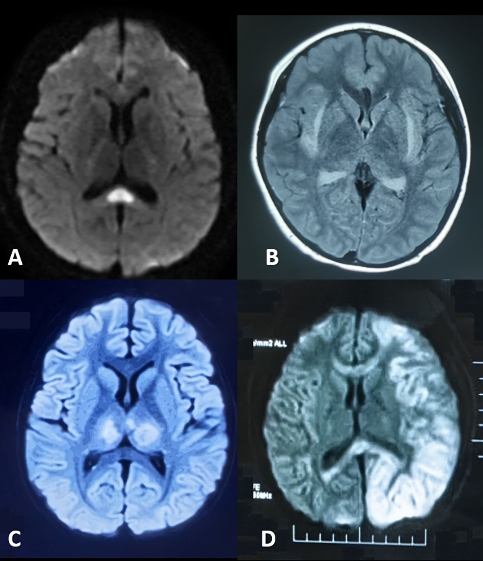 Figure 2. Neuroimaging of parainfectious encephalopathies. (A) Mild Encephalopathy with Reversible Splenial Lesion: splenium of the corpus callosum hyperintensity on diffusion-weighted imaging (DWI). (B) Febrile Infection-Related Epilepsy Syndrome with Claustrum Lesion: bilateral claustrum hyperintensity on T2-weighted and fluid-attenuated inversion recovery (FLAIR) imaging. (C) Acute Necrotizing Encephalopathy: bilateral thalamic hyperintensity on T2/FLAIR imaging. (D) Hemiconvulsion-Hemiplegia Syndrome: left cerebral cortex and subcortical hyperintensity on DWI with corpus callosum involvement and associated edema.