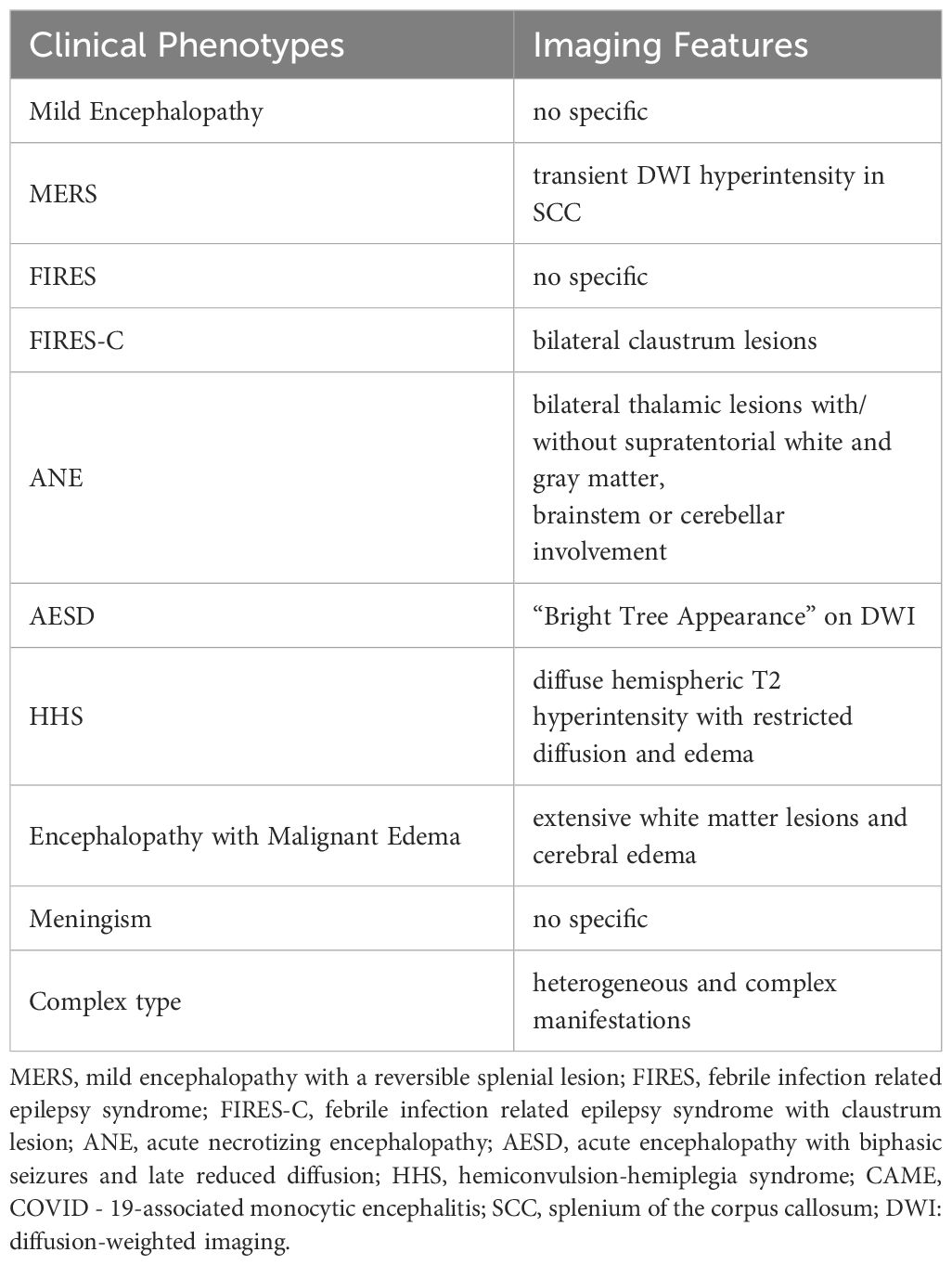 ANE, FIRES-C, MERS, AESD, and HHS exhibit distinct clinical and neuroimaging phenotypes (Table 1), making them recognizable and diagnosable. In contrast, other subtypes of parainfectious encephalopathy lack specific features and pose greater diagnostic challenges, necessitating thorough differential diagnosis (Table 2).