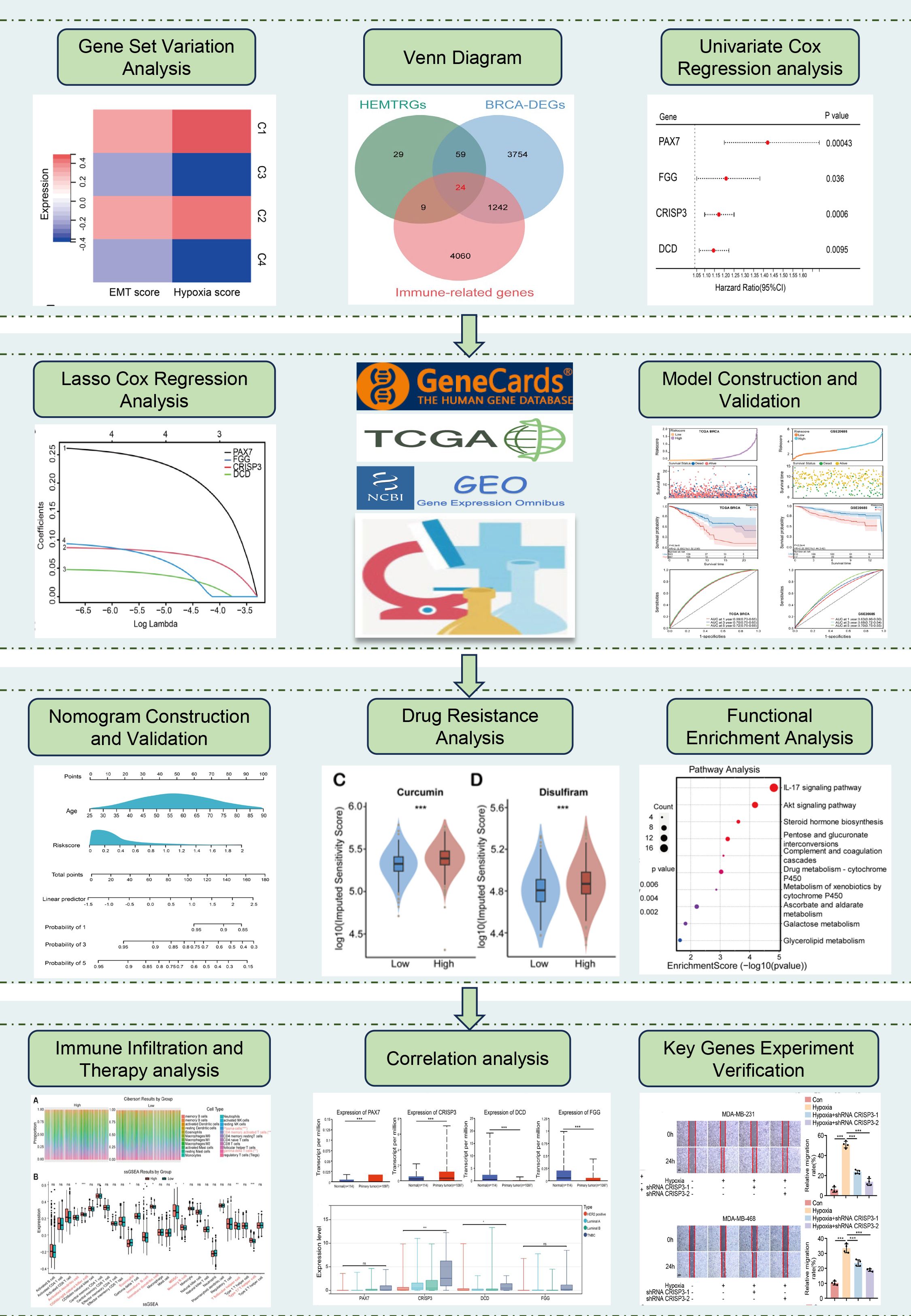 Breast cancer (BC) remains the most common cancer among women worldwide, accounting for approximately 31% of all female cancers (1). Despite significant advancements in early detection and treatment, BC recurrence remains a major challenge, contributing to increased mortality risk (2). Recent advances in surgical strategies, systemic therapies, and prognostic assessment have improved the management of BC (3–5). However, a major limitation in current clinical practice remains the lack of reliable approaches to accurately predict prognosis, identify high-risk patients, and evaluate responses to immunotherapy. To address this gap, the present study develops a novel prognostic signature by integrating genes associated with hypoxia, epithelial–mesenchymal transition (EMT), and immune regulation.