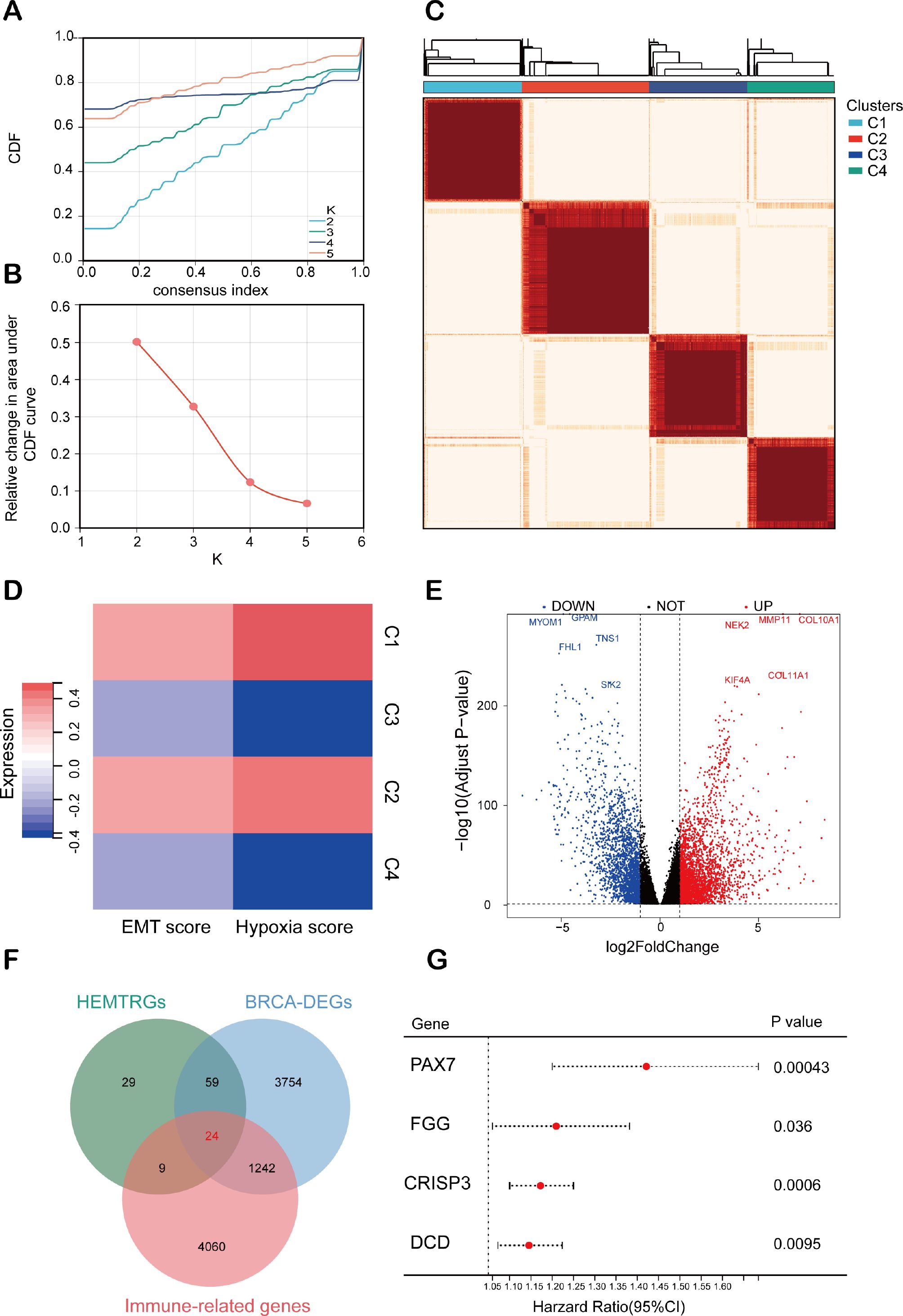 Figure 2. Consensus clustering analysis for identifying HEMTIRGs. (A) Consensus clustering CDF for k = 2-5. (B) Relative change in area under the CDF curve for k = 2-5. (C) Consensus clustering matrix for k = 4. (D) Heatmap of hypoxia scores and EMT scores for the 4 subgroups. (E) Volcano plot of the 5078 DEGs. (F) The Venn diagram of analysis of HEMTRGs, BRCA-DEGs, and immune-related genes. (G) Forest plot of the univariate Cox regression analysis.
