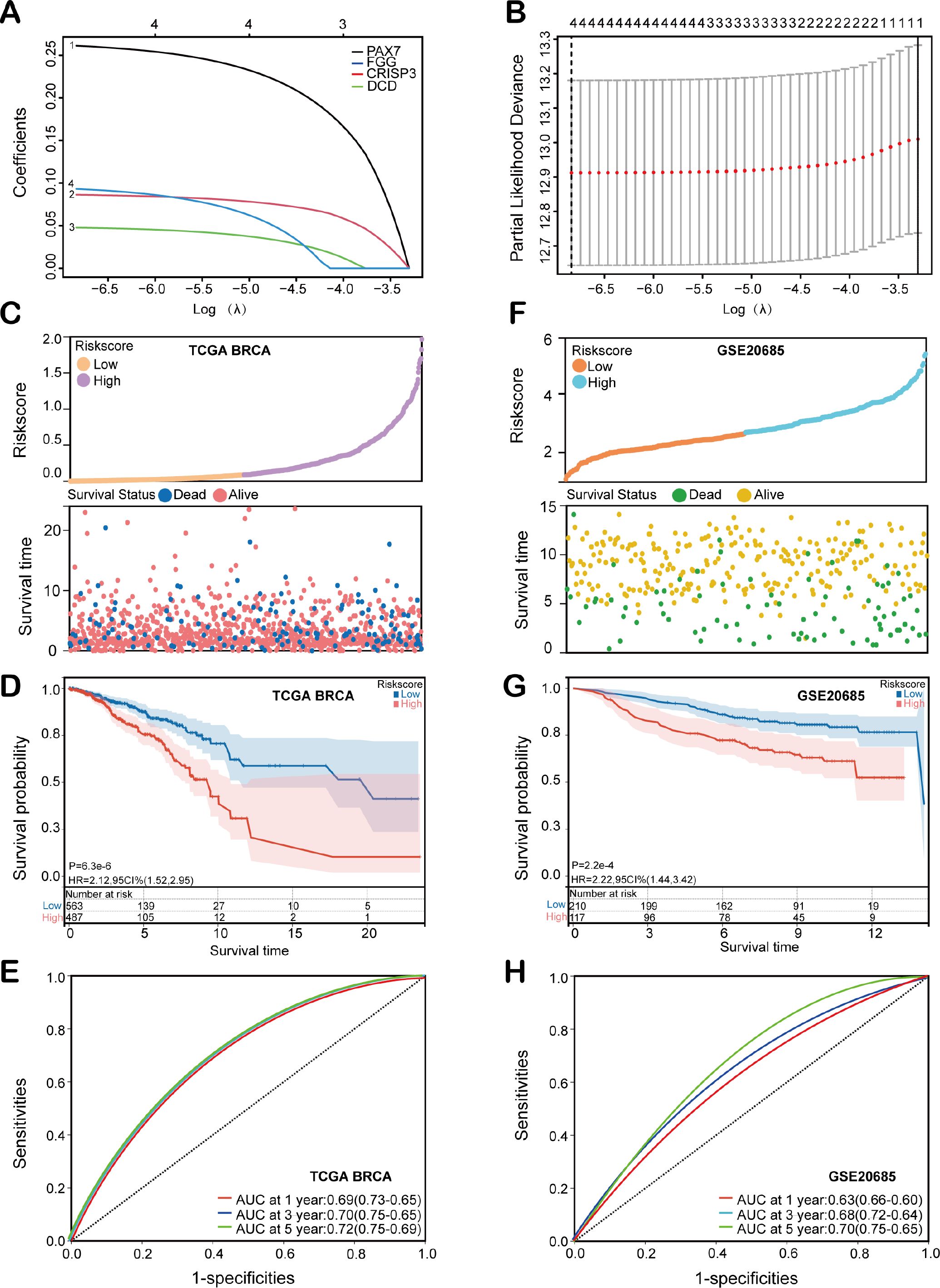Figure 3. Construction and evaluation of the HEMTIRGs-based prognostic model. (A) LASSO coefficient profiles of the four HEMTIRGs. (B) Coefficient profile plot generated against the log (λ) sequence in the LASSO model, with the optimal λ value indicated by a vertical black dotted line. (C) Distribution of risk score (top), and survival status with survival time (bottom) in the TCGA BRCA training cohort. Patients were stratified into high-risk (purple) and low-risk (yellow) groups according to the median risk score, while survival status is indicated as alive (red) or dead (blue). (D) Kaplan-Meier curves of HEMTIRGs in the TCGA BRCA training cohort. (E) The time-dependent ROC curves of the HEMTIRGs in the TCGA BRCA training cohort. (F) The distribution of the risk score (top), and survival status with survival time (bottom) in the GSE20685 validation cohort. Patients were stratified into high-risk (orange) and low-risk (blue) groups according to the median risk score, while survival status is indicated as alive (yellow) or dead (green). (G) Kaplan-Meier curves of the HEMTIRGs in the GSE20685 validation cohort. (H) The time-dependent ROC curves of the HEMTIRGs in the GSE20685 validation cohort.