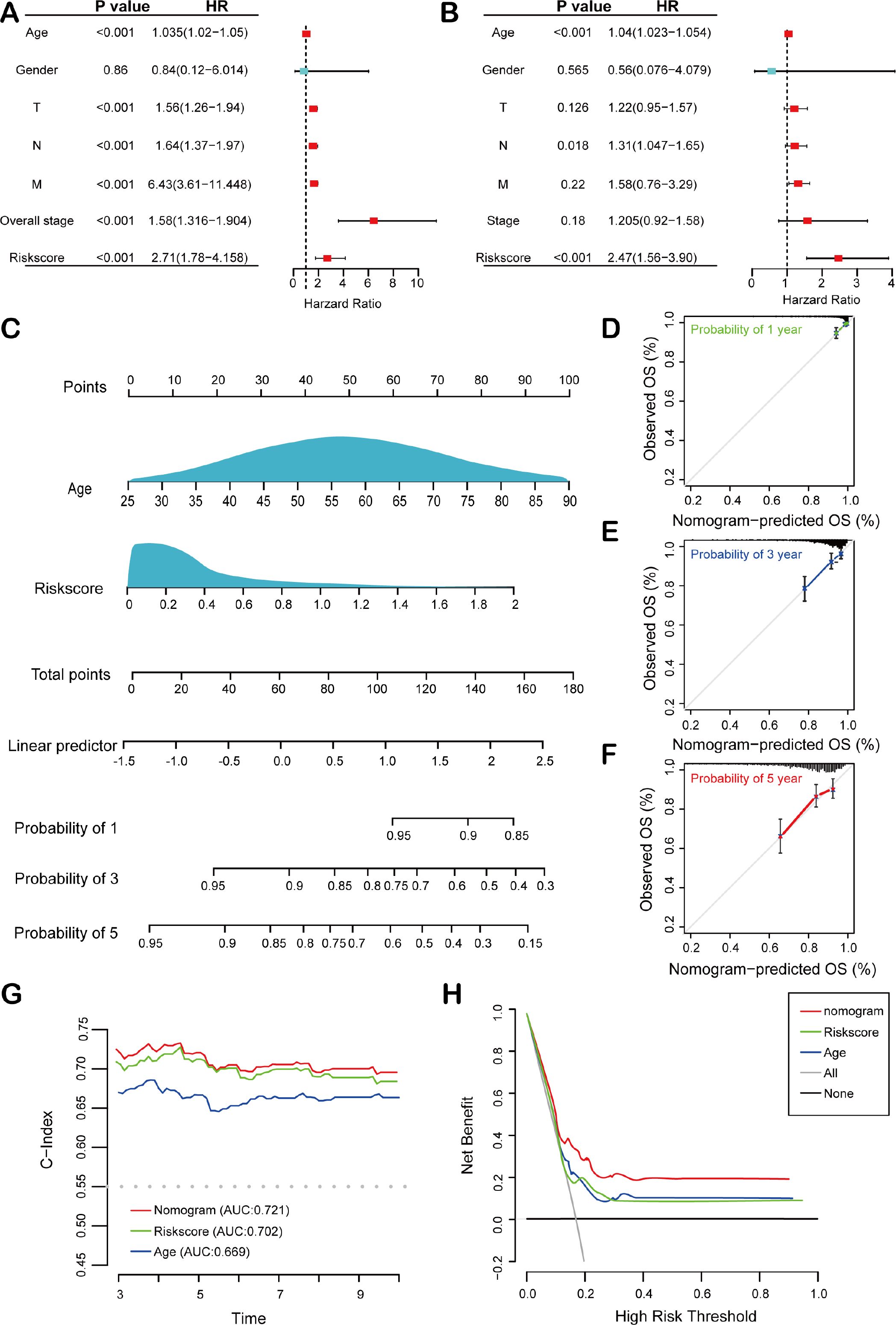 Figure 4. Construction and validation of the nomogram. Forest plots of the (A) univariate and (B) multivariate Cox regression analysis in the TCGA BRCA cohort. (C) The nomogram was developed based on age and risk score. The calibration plots were generated to predict the (D) 1-year, (E) 3-year, and (F) 5-year OS rates. The X-axis displays the nomogram-predicted survival, and the y-axis represents the actual survival. (G) The concordance index curves of the nomogram, risk score, and age. (H) DCA curves for nomogram, risk score, and age.