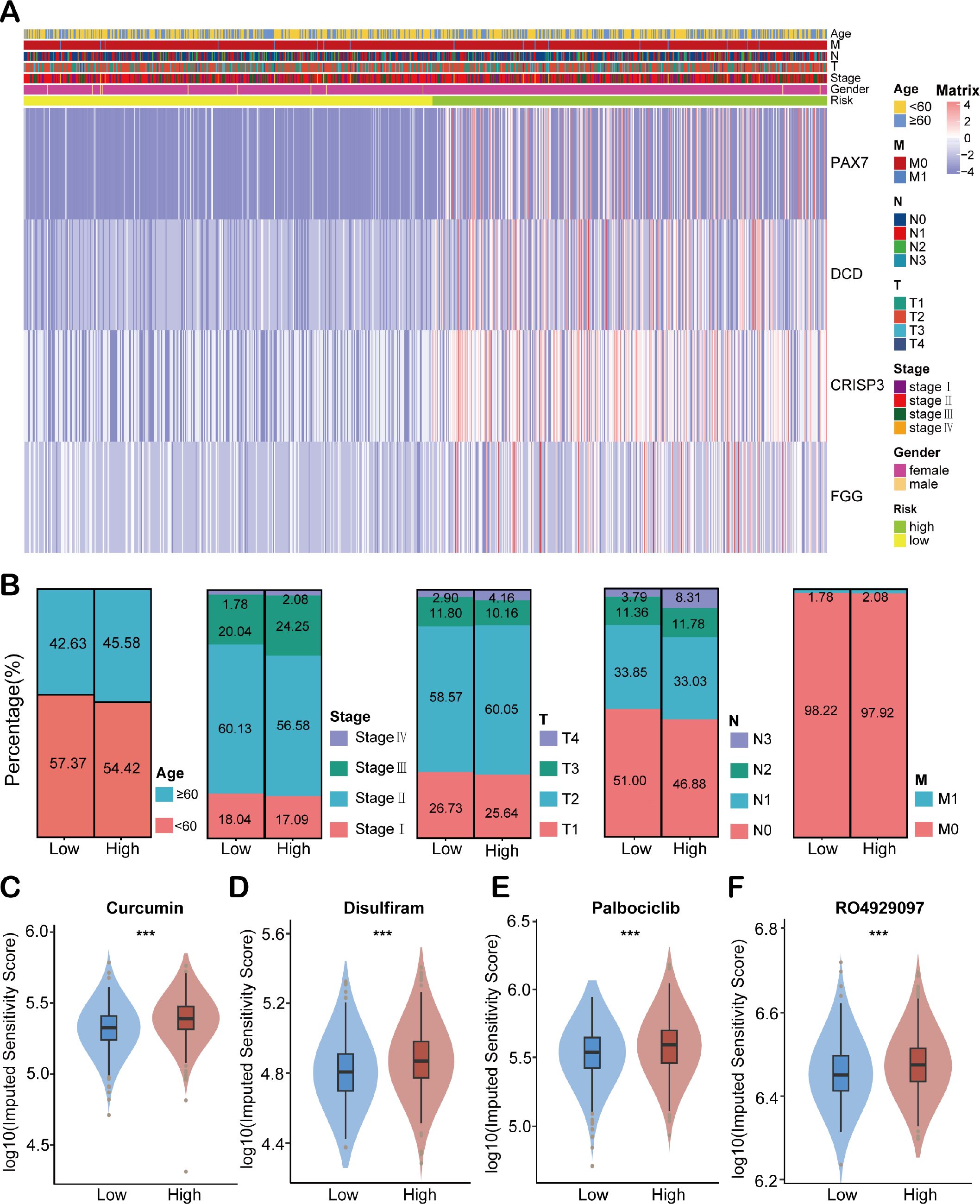 Figure 5. Clinical correlation analysis of HEMTIRGs. (A) The heatmap of HEMTIRGs expression associated with age, T, N, M, stage, gender, and risk scores. (B) Distribution of clinicopathological characteristics (age, overall stage, T stage, N stage, and M stage) between high- and low-risk groups. (C–F) Drug sensitivity analysis between high- and low-risk groups for EMT inhibitors, including (C) curcumin, (D) disulfiram, (E) palbociclib, and (F) RO4929097. Statistical significance was determined by an unpaired Student’s t-test. ***p < 0.001.