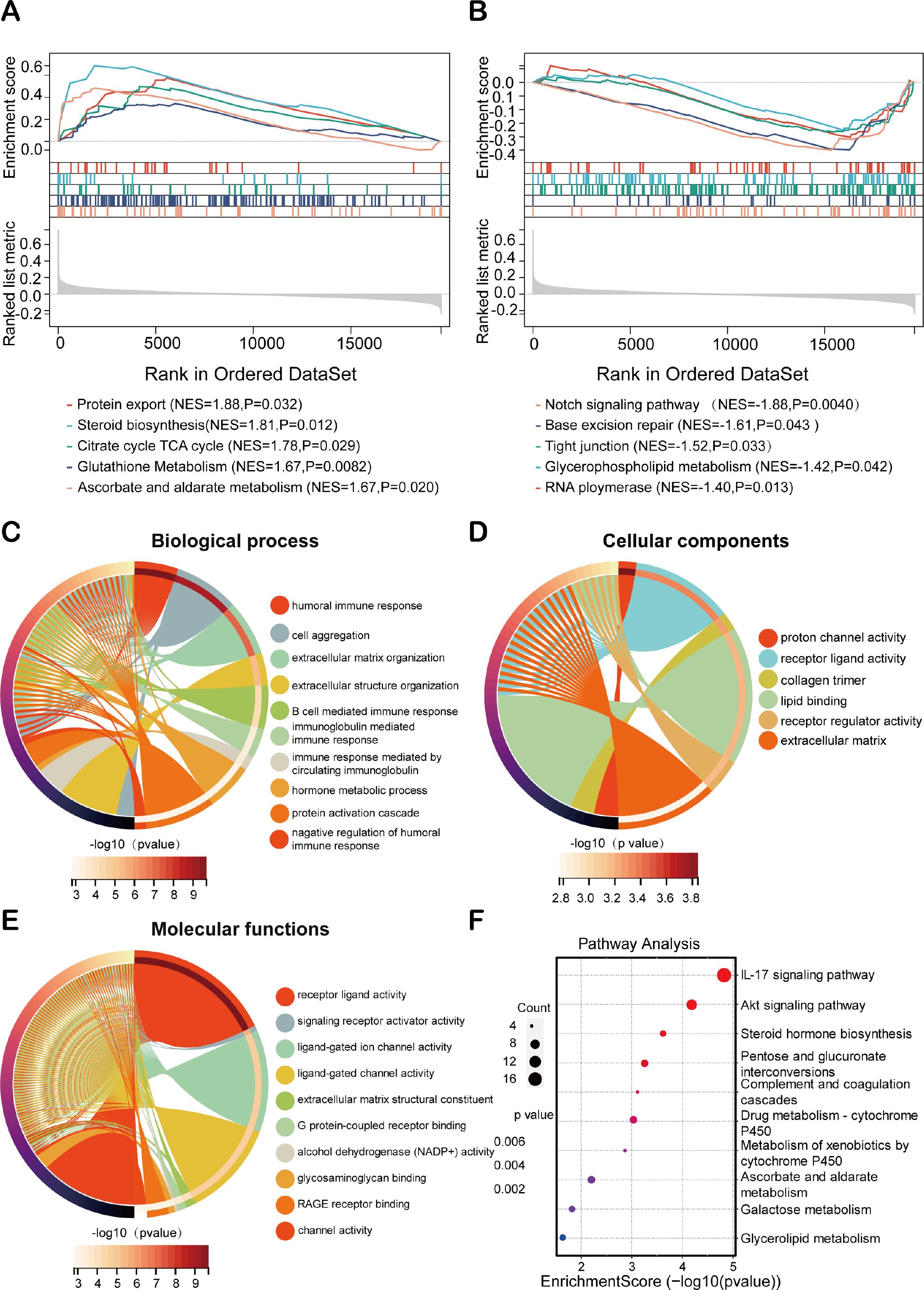Figure 6. Exploration on molecular functions and signaling pathways of HEMTIRGs. Enrichment plot of the DEGs between the (A) high- and (B) low-risk groups using GSEA (Gene Set Enrichment Analysis). (C–E) GO (Gene Ontology) analysis, including (C) BP (Biological Processes), (D) CC (Cellular Components), and (E) MF (Molecular Functions). (F) KEGG (Kyoto Encyclopedia of Genes and Genomes) analysis.