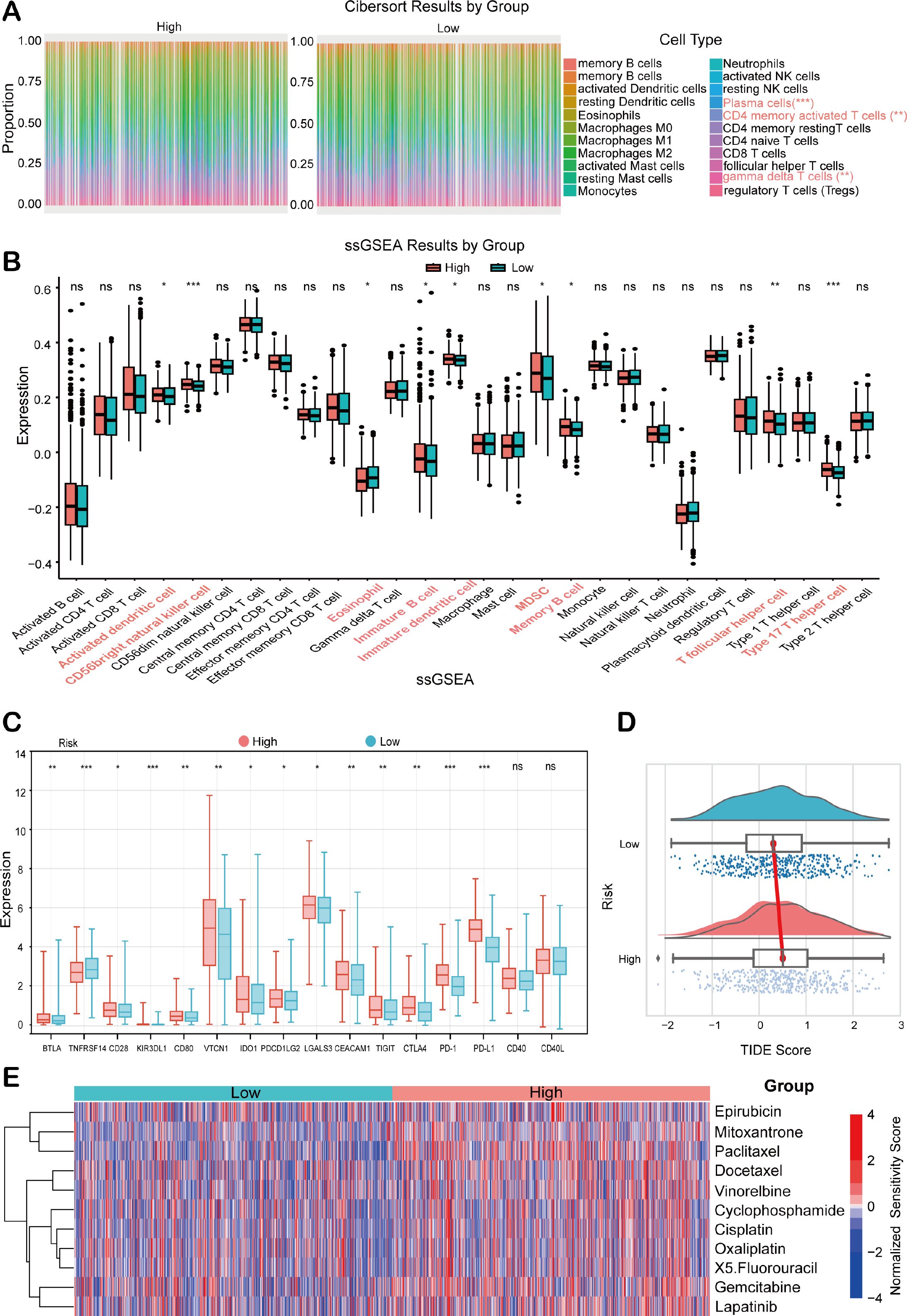 Figure 7. Analysis of the immune status in BC patients combined with prognostic modeling. (A) The relative proportions of 22 tumor-infiltrating immune cell types in high- and low-risk groups of the TCGA BRCA cohort. (B) ssGSEA scores in the high- and low-risk groups. (C) Immune checkpoint expression analysis between high- and low-risk groups. (D) TIDE score analysis between high- and low-risk groups. (E) Chemotherapeutic drug sensitivity analysis between high- and low-risk patients. Statistical significance was determined by an unpaired Student’s t-test. *p < 0.05, **p < 0.01, ***p < 0.001, ns, not significant.