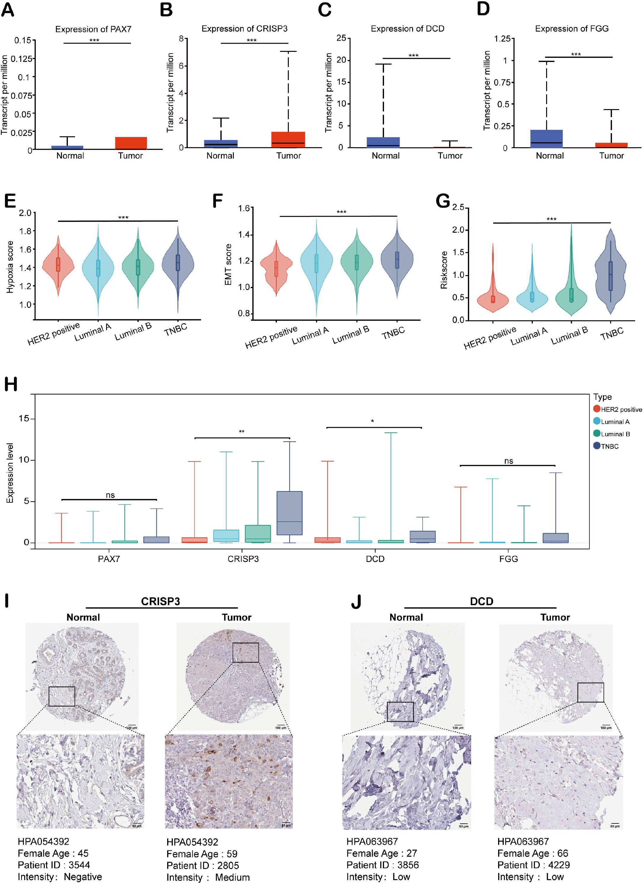Figure 8. Expression analysis of HEMTIRGs in the TCGA BRCA cohort. Expression of (A) PAX7, (B) CRISP3, (C) DCD, and (D) FGG in BC and normal tissues for the TCGA BRCA cohort. (E) Hypoxia, (F) EMT, and (G) hypoxia-EMT risk scores for four subtypes of BC. (H) Expression of PAX7, CRISP3, DCD, and FGG in four subtypes of BC. (I, J) Immunohistochemical images of CRISP3 and DCD protein in normal and BC tissues. Protein expression was quantified based on the percentage of immunopositive cells and categorized as follows: negative (0%), weakly positive (<25%), moderately positive (25-75%), or strongly positive (>75%). Statistical significance was determined using one-way ANOVA. *p< 0.05, **p < 0.01, ***p < 0.001, ns, not significant.