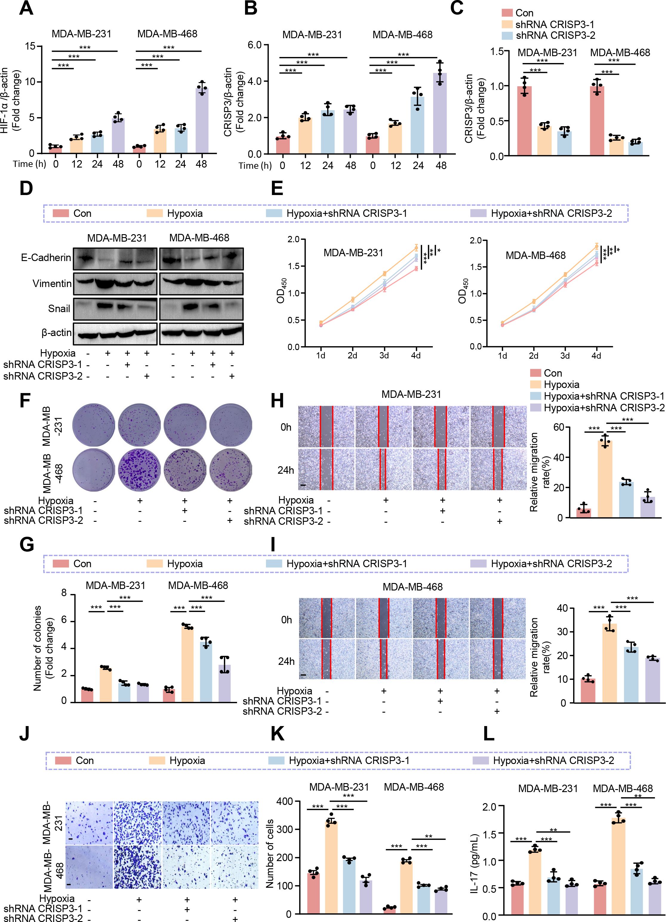 Figure 9. CRISP3 knockdown attenuates hypoxia-induced TNBC cell proliferation, migration, and EMT. MDA-MB-231 and MDA-MB-468 cells were transduced with pLKO.1-TRC shRNA as control (Con) or pLKO.1-CRISP3 shRNA to silence CRISP3 (shRNA CRISP3). qRT-PCR analysis of the mRNA expression of (A) HIF-1α and (B) CRISP3 under hypoxia conditions in MDA-MB-231 and MDA-MB-468 cells. (C) qRT-PCR analysis of CRISP3 silencing efficiency in MDA-MB-231 and MDA-MB-468 cells. (D) Immunoblotting analysis of EMT markers. (E) The CCK8 assay, and (F–G) colony formation assay were employed to evaluate cell proliferation. (H, I) Wound healing assay, and (J–K) transwell assay were conducted for assessment of migrative ability. (L) ELISA was performed to measure the level of IL-17 in the conditioned medium of MDA-MB-231 and MDA-MB-468 cells. Statistical significance was determined using one-way ANOVA. Data are presented as mean ± SEM (n = 4). *p < 0.05, **p < 0.01, ***p < 0.001. Scale bar = 0.1 mm.