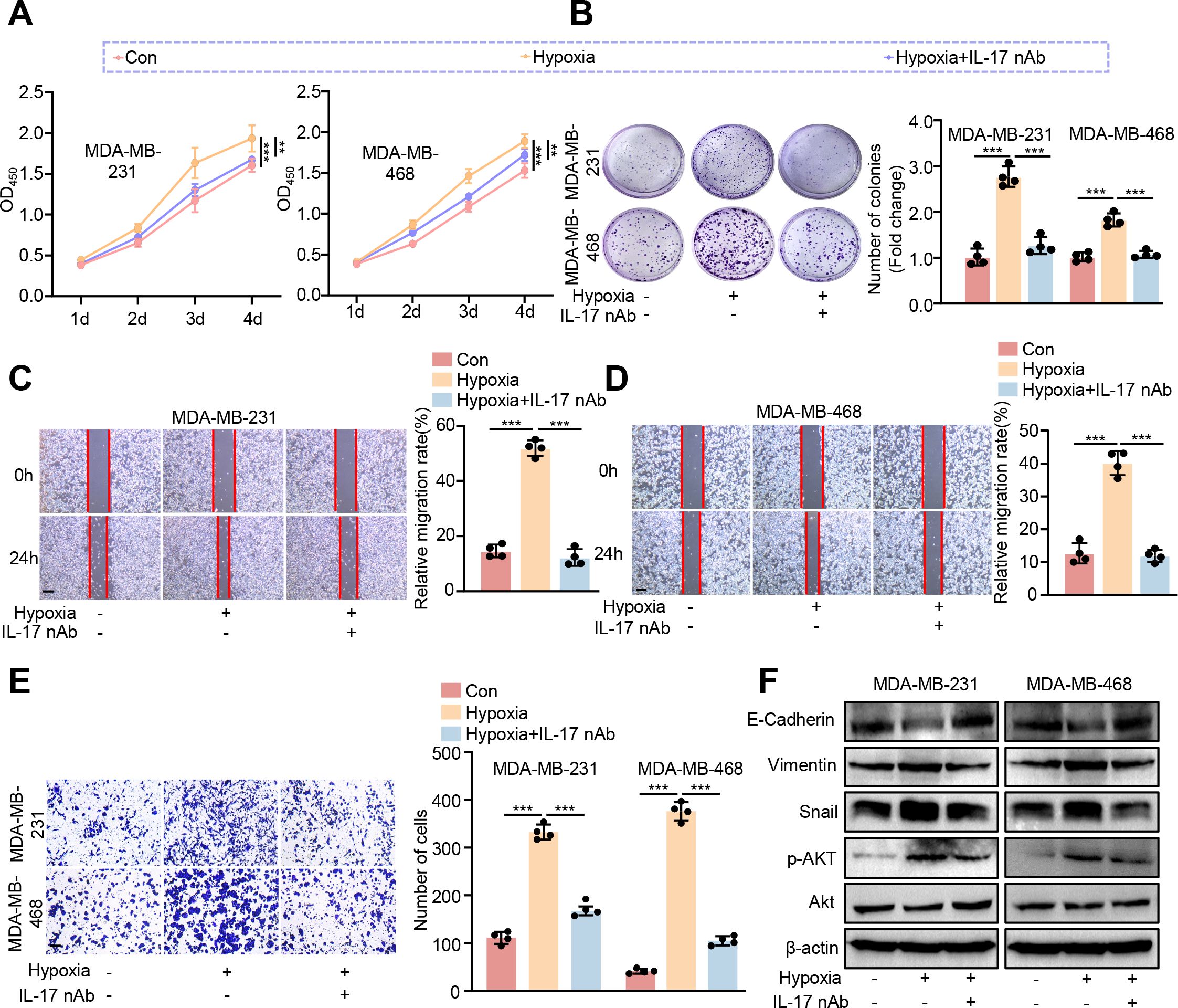 For hypoxia treatment, cells were incubated in a controlled hypoxic chamber with 1% O2, 5% CO2, and 94% N2, while normoxic conditions were maintained at 21% O2 and 5% CO2. IL-17 neutralizing antibody (nAb) treatment was administered at a final concentration of 10 μg/mL.