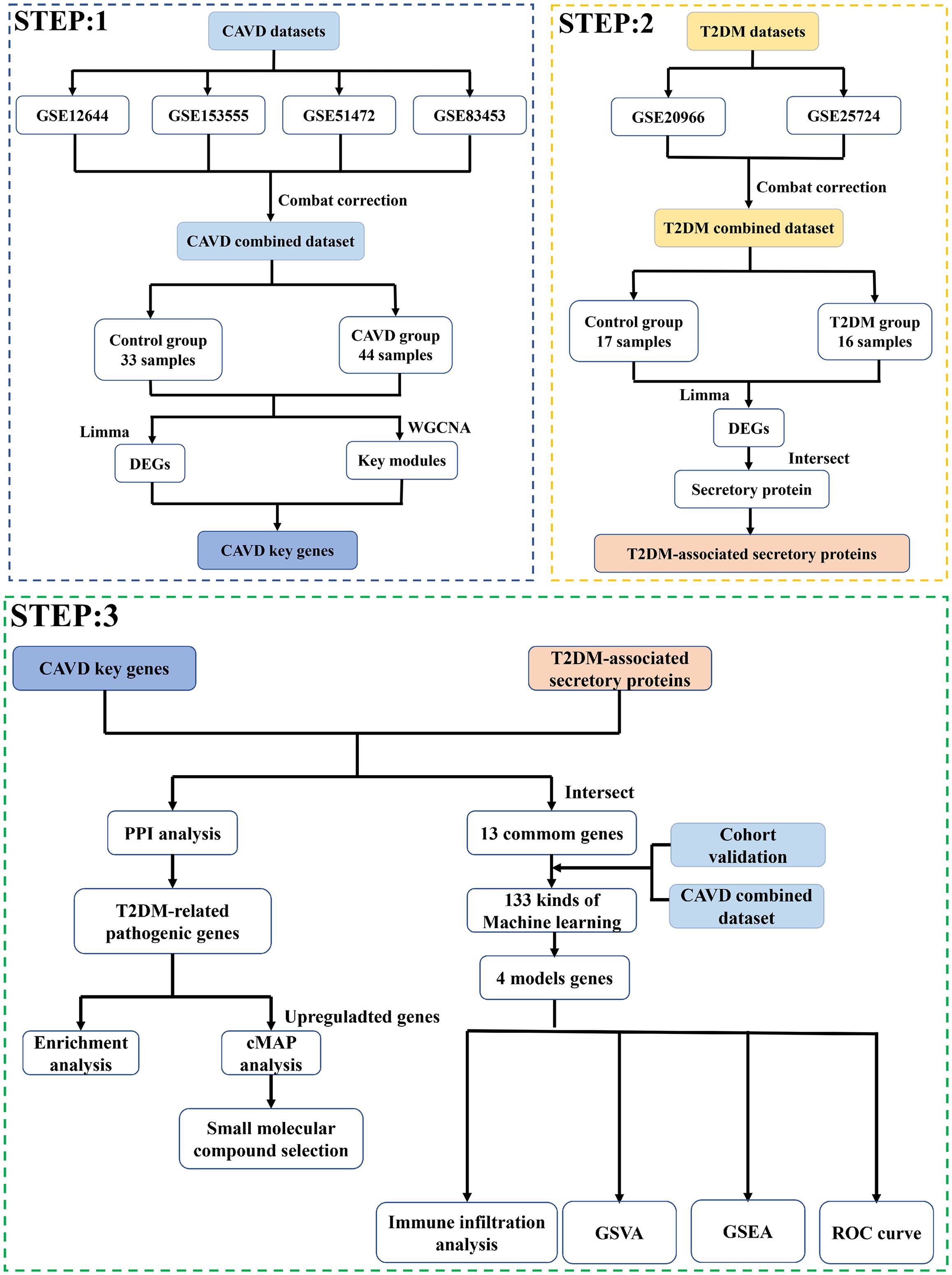 AUC, average area under the curve; CAVD, calcific aortic valve disease; cMAP, Connectivity Map; DEGs, Differentially Expressed Genes; GEO, Gene Expression Omnibus; GO, Gene Ontology; KEGG, Kyoto Encyclopedia of Genes and Genomes; MAD, Median absolute deviation; ML, machine learning; PCA, Principal component analysis; PMA, phorbol-12-myristate-13-acetate; PPI, Protein-protein interaction; T2DM, Type 2 diabetes mellitus; WGCNA, weighted gene co-expression network analysis.