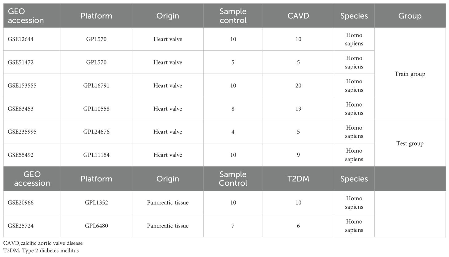 Six raw expression datasets (GSE12644, GSE51472, GSE153555, GSE83453, GSE235995, GSE55492) comprising CAVD test/training cohorts, along with two T2DM datasets (GSE20966, GSE25724), were retrieved from the GEO database. Using the “sva” R package (v4.3.1) (14), batch correction was performed on four CAVD datasets (GSE12644, GSE51472, GSE153555, GSE83453) via the ComBat algorithm, generating an integrated CAVD expression matrix containing 44 calcified and 33 control samples. Datasets GSE235995 and GSE55492 were processed as independent test cohorts for subsequent validation. Detailed descriptive information of datasets was shown in Table 1.