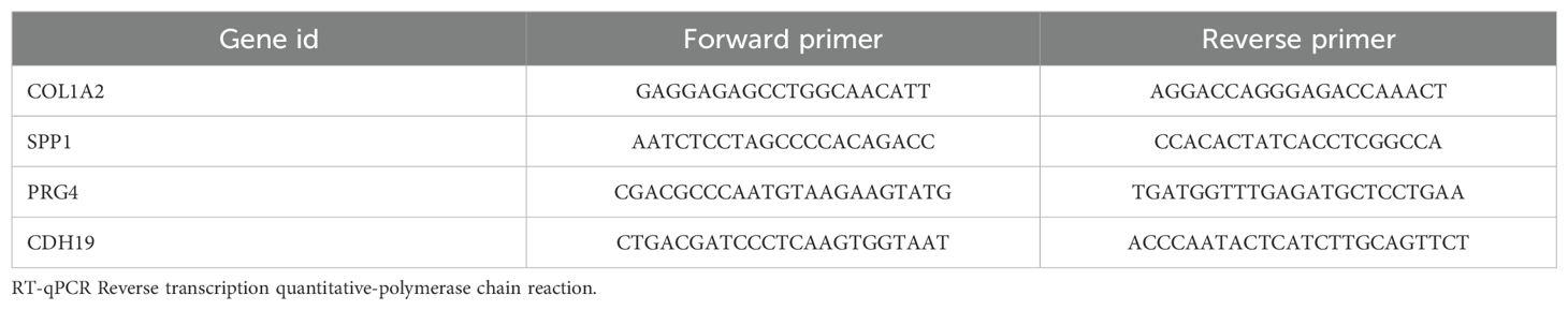 To further elucidate the expression patterns of diagnostic biomarkers and their potential associations with infiltrating immune cells, we performed a comprehensive correlation analysis (Supplementary Figure S1). CDH19 expression exhibited a strong positive correlation with Mast cells resting (r = 0.64, p < 0.001) and T cells CD4 memory resting (r = 0.36, p = 0.017), while displaying a negative correlation with Macrophages M0 (r = −0.37, p = 0.013) (Figure 9A). COL1A2 was positively correlated with B cells naive (r = 0.43, p = 0.004) and negatively correlated with Plasma cells (r = −0.36, p = 0.017) (Figure 9B). PRG4 demonstrated positive correlations with both T cells CD4 memory resting (r = 0.39, p = 0.009) and T cells CD4 memory activated (r = 0.33, p = 0.030), while negatively correlated with Macrophages M0 (r = −0.32, p = 0.035) (Figure 9C). SPP1 exhibited significant correlations with various immune cell subsets, showing positive associations with T cells follicular helper (r = 0.50, p < 0.001), Macrophages M0 (r = 0.40, p = 0.008), Mast cells activated (r = 0.37, p = 0.015), and NK cells resting (r = 0.33, p = 0.029), while demonstrating negative correlations with Macrophages M1 (r = −0.40, p = 0.008), Mast cells resting (r = −0.31, p = 0.039), and T cells CD4 naive (r = −0.30, p = 0.046) (Figure 9D).