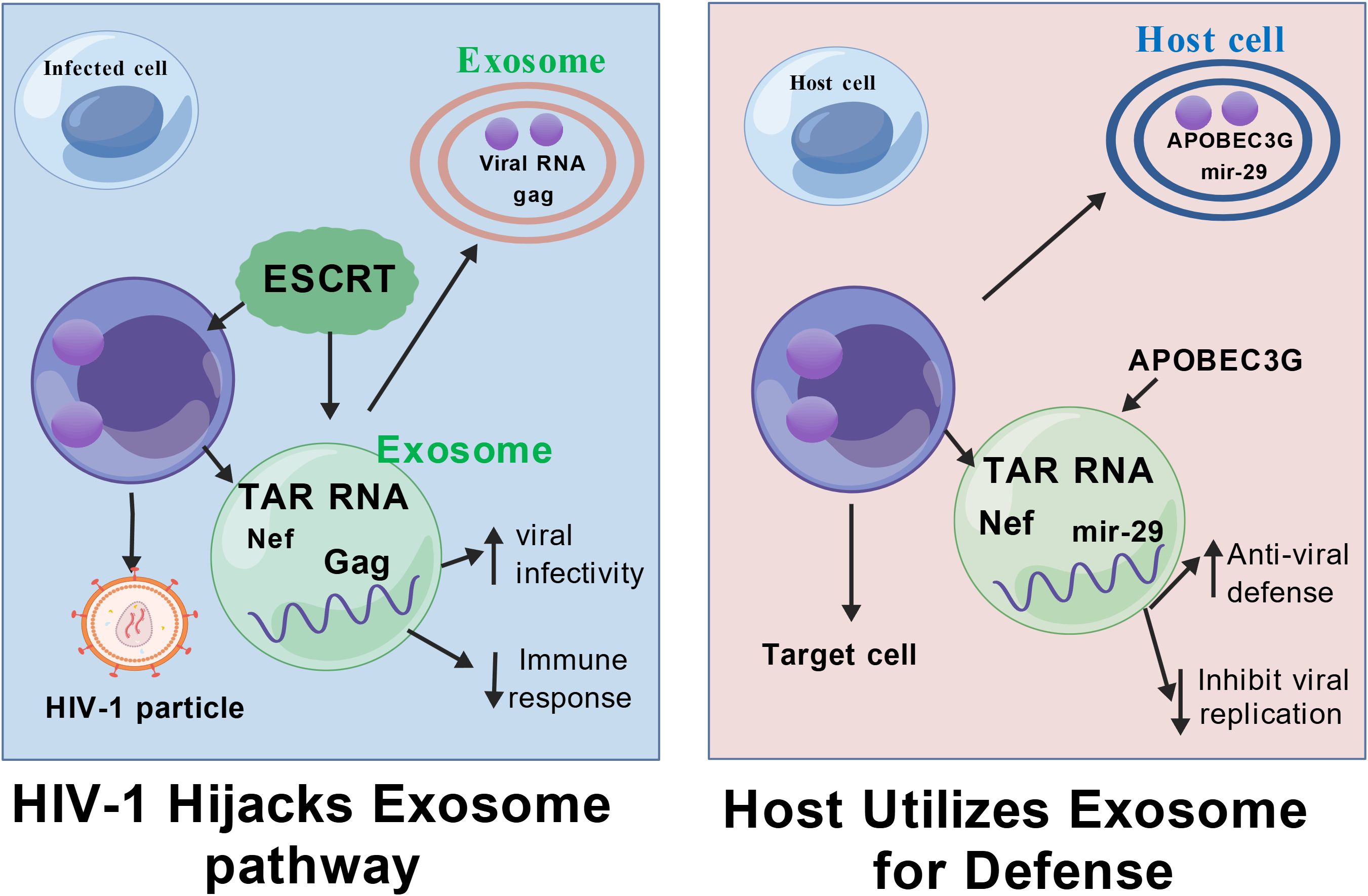 Figure 1. Dual role of exosomes in HIV-1 transmission and immune escape.Exosomes carry proteins, RNA, and other components that can interact with HIV-1 through the ESCRT pathway, and HIV-1 can hijack the exosome secretion pathway to deliver viral components, facilitate infection and evade immune surveillance. Exosomes are also capable of carrying viral RNA and DNA, affecting host cell gene expression and function.Figure Created with BioGDP.com.