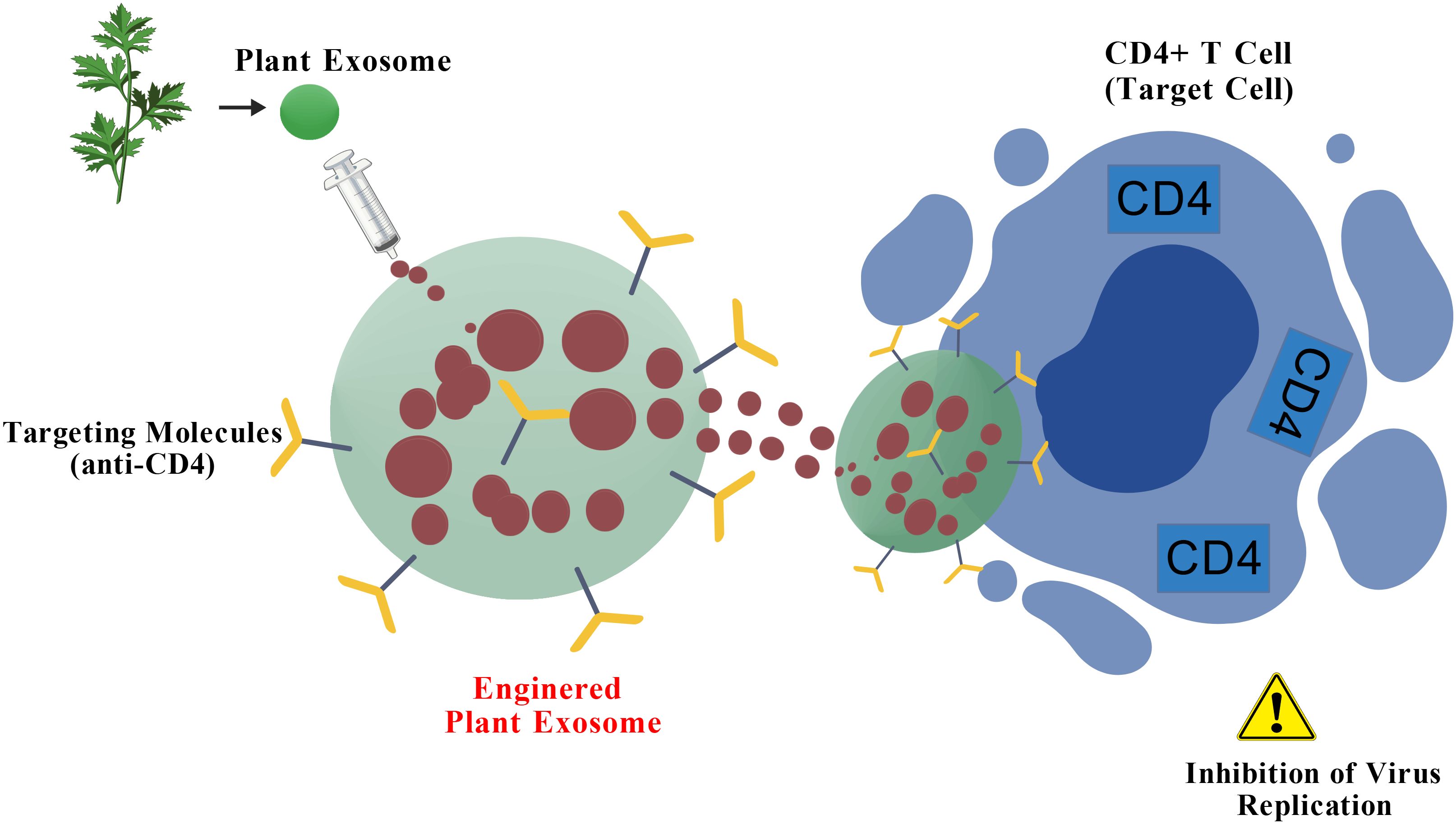 Figure 3. Potential of plant-derived exosomes for HIV-1 therapy. After exosomes are extracted from plants, they can be engineered to carry chemical drugs. These modified exosomes can be used as drug delivery systems to target anti-HIV drugs to target cells such as CD4+ T cells, thereby increasing therapeutic efficacy and reducing the impact on non-target cells. This process combines the natural advantages of plant-derived exosomes with modern bioengineering and drug design techniques, providing innovative ideas for developing novel anti-HIV therapeutic strategies. Figure Created with BioGDP.com.