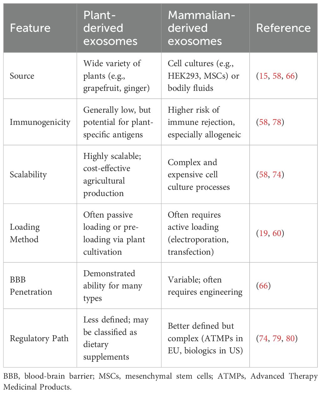 While plant exosomes present a promising, cost-effective alternative to mammalian vectors—particularly for their high scalability and generally low immunogenicity—a clearer perspective requires a critical comparison against alternative delivery systems, as summarized in Table 1. However, the translation of plant exosomes into clinical use is not without significant critical challenges. Variability in molecular cargo and quantity between plant sources, potential host-specific immunogenicity, and a limited understanding of their precise mechanistic behavior in human systemic circulation remain major hurdles (58, 74, 78). In conclusion, to fully realize their potential in HIV-1 therapy, future research must address three crucial bottlenecks: standardization of isolation protocols (to ensure consistency and homogeneity), rigorous safety and pharmacokinetic profiling in vivo, and clarification of the complex global regulatory pathways (72–80). This concerted effort is necessary to move these highly promising natural nanocarriers from the bench to the bedside.