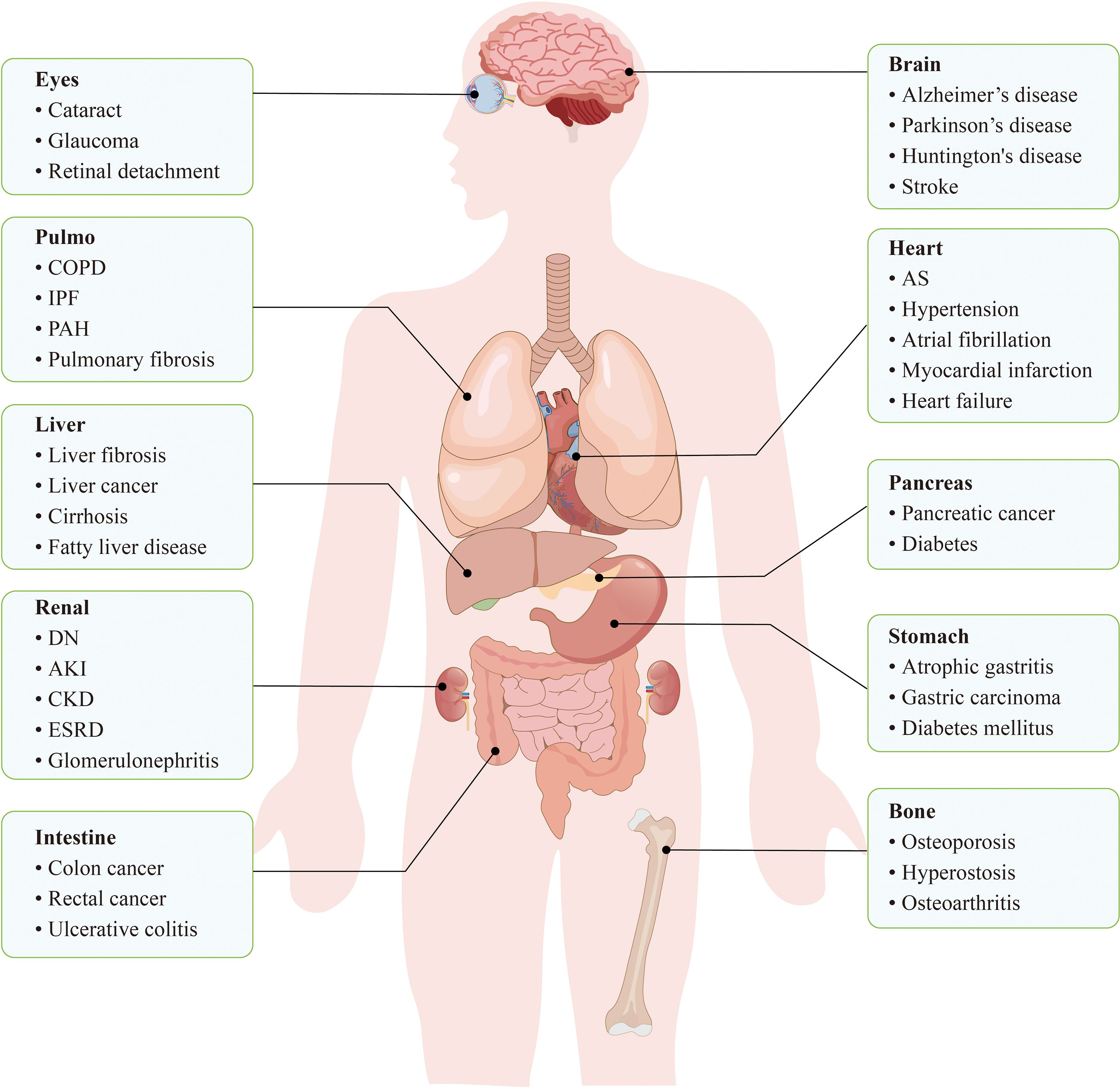 Figure 1. Cellular senescence is closely related to a variety of diseases throughout the body. In the cardiovascular system, cellular senescence leads to dysfunction of ECs, VSMCs, etc., which in turn increases the risk of diseases such as hypertension, AS, and cardiac infarction. In the nervous system, neuronal senescence may trigger neurodegenerative diseases, such as Alzheimer’s disease and Parkinson ‘s disease. In conclusion, cellular senescence accumulates in systemic tissues and becomes a potential trigger for a variety of diseases.