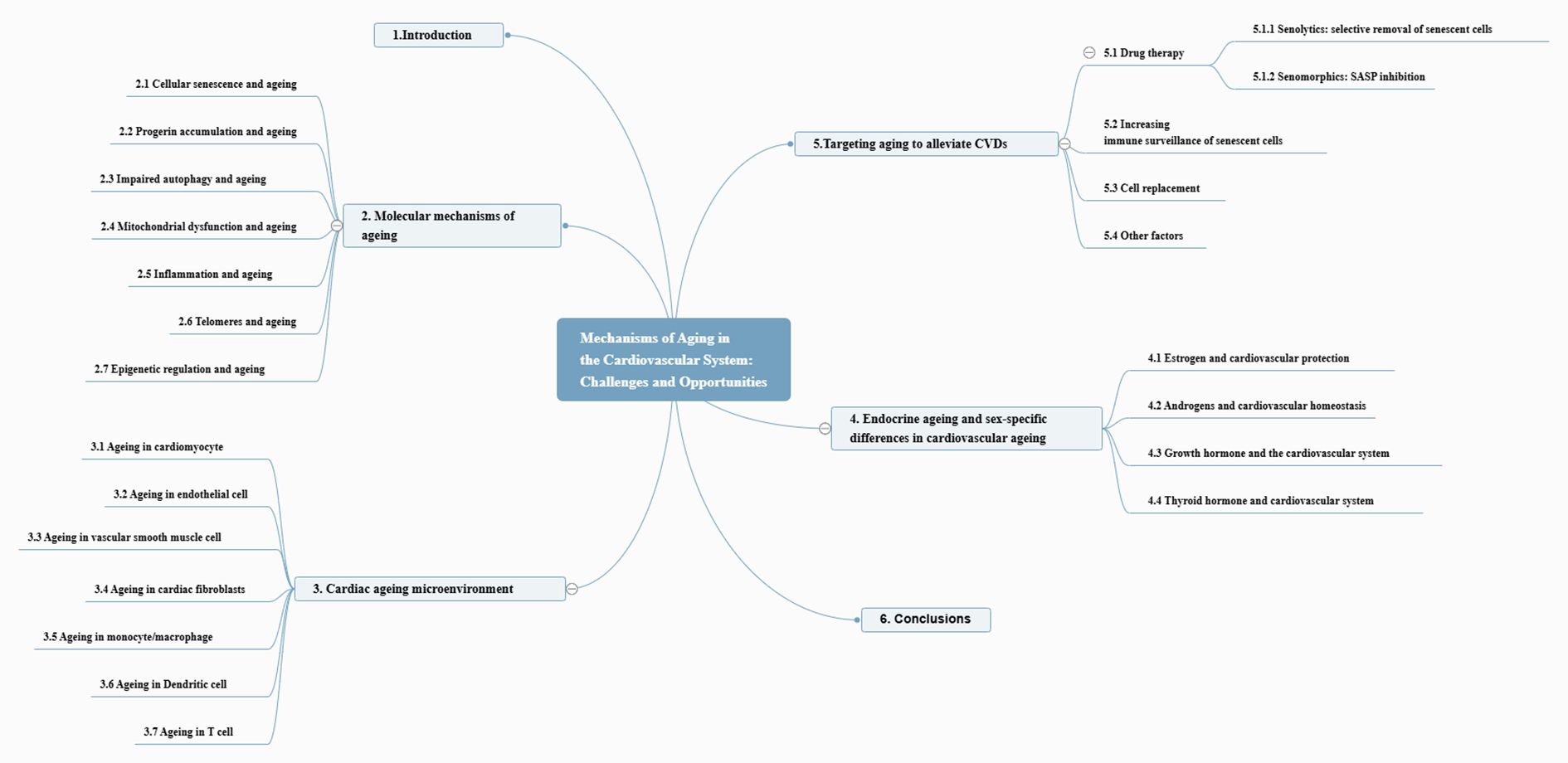 This manuscript discusses the phenotypic expressions and underlying molecular pathways correlated with the ageing process and their contribution to the development of CVDs. Additionally, we assessed the advantages and challenges of targeting senescent cells in preventing and managing ageing-related CVDs. The entire framework of the article is depicted in Figure 2.