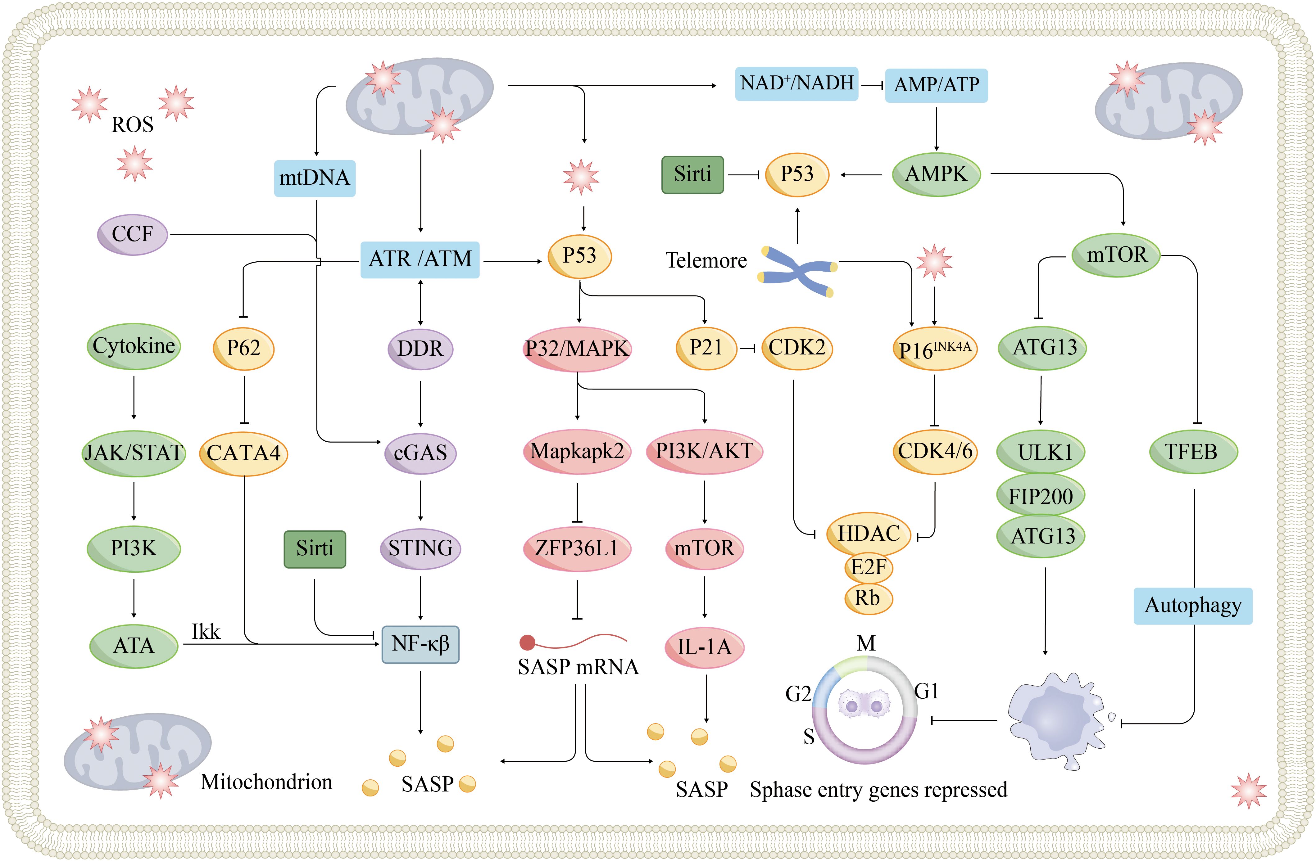 Figure 3. Signaling pathways and mechanisms of cellular senescence. Cellular senescence is a cellular state triggered by stress injury and some physiological processes, which is mainly divided into replicative senescence and non-replicative senescence. Replicative senescence is caused by telomere shortening due to continuous division of normal cells, and when telomeric DNA shortens to a certain extent, cells automatically turn on the ageing program and prevent cell cycle progression through the p53/p21 and p16INK4A/Rb signaling pathways. Non-replicative ageing can be triggered by various stress factors, and nuclear DNA damage is an important role. DNA damage-activated DDR can lead to p53 activation via ATM or ATR kinase activation, which in turn triggers cell cycle arrest. DDR can also induce SASP secretion via the cGAS-STING pathway. SASP components secreted by nearby senescent cells, such as IL-6, trigger the JAK-STAT signaling pathway, the so-called paracrine-induced senescence. In addition, mitochondrial dysfunction has been implicated as a driver of cellular senescence, mainly through three different mechanisms, which have been described in detail previously. ATM, Ataxia-Telangiectasia mutated; ATR, Ataxia-Telangiectasia and Rad3-related protein; CCF, cytoplasmic chromatin fragments; MAPK, mitogen-activated protein kinases; mtDNA, Mitochondrial DNA; ULK1, UNC-51-like kinases 1.