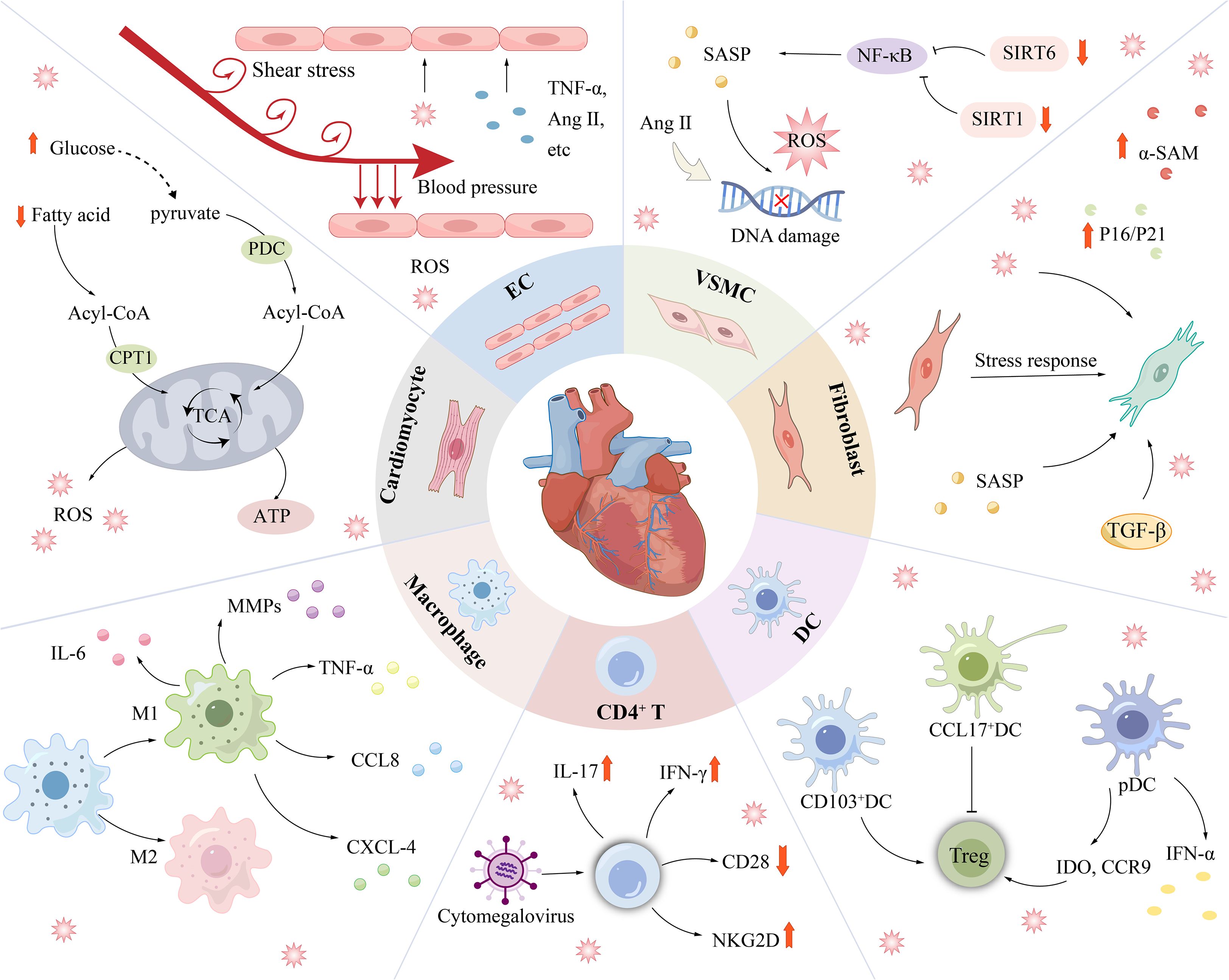 Figure 4. Cardiovascular disease is associated with senescence of a variety of cells. Senescent cardiomyocytes mainly showed decreased fatty acid oxidation ability and enhanced glucose oxidation pathway. ECs are continuously exposed to unique injury-stimulating environments (blood flow pressure, blood flow shear stress, circulating factors, pathogenic stimuli, etc.) and are therefore highly susceptible to injury. In addition to being affected by DNA damage, oxidative stress, etc., SIRT6 deficiency and SIRT1 inactivation can lead to senescence in VSMCs. Under stress conditions, the phenotype of CFs is irreversibly altered, as shown by an increase in ageing markers such as α-SMA. Immune-related cells such as DCs, Macrophages, and T cells regulate the progression of cardiovascular disease mainly through changes in inflammatory factors. α-SMA, myofibroblast marker; Ang II, Angiotensin II; CPT1, carnitine palmitoyl transterase-1; SIRT1/6, Sirtuin 1/6.