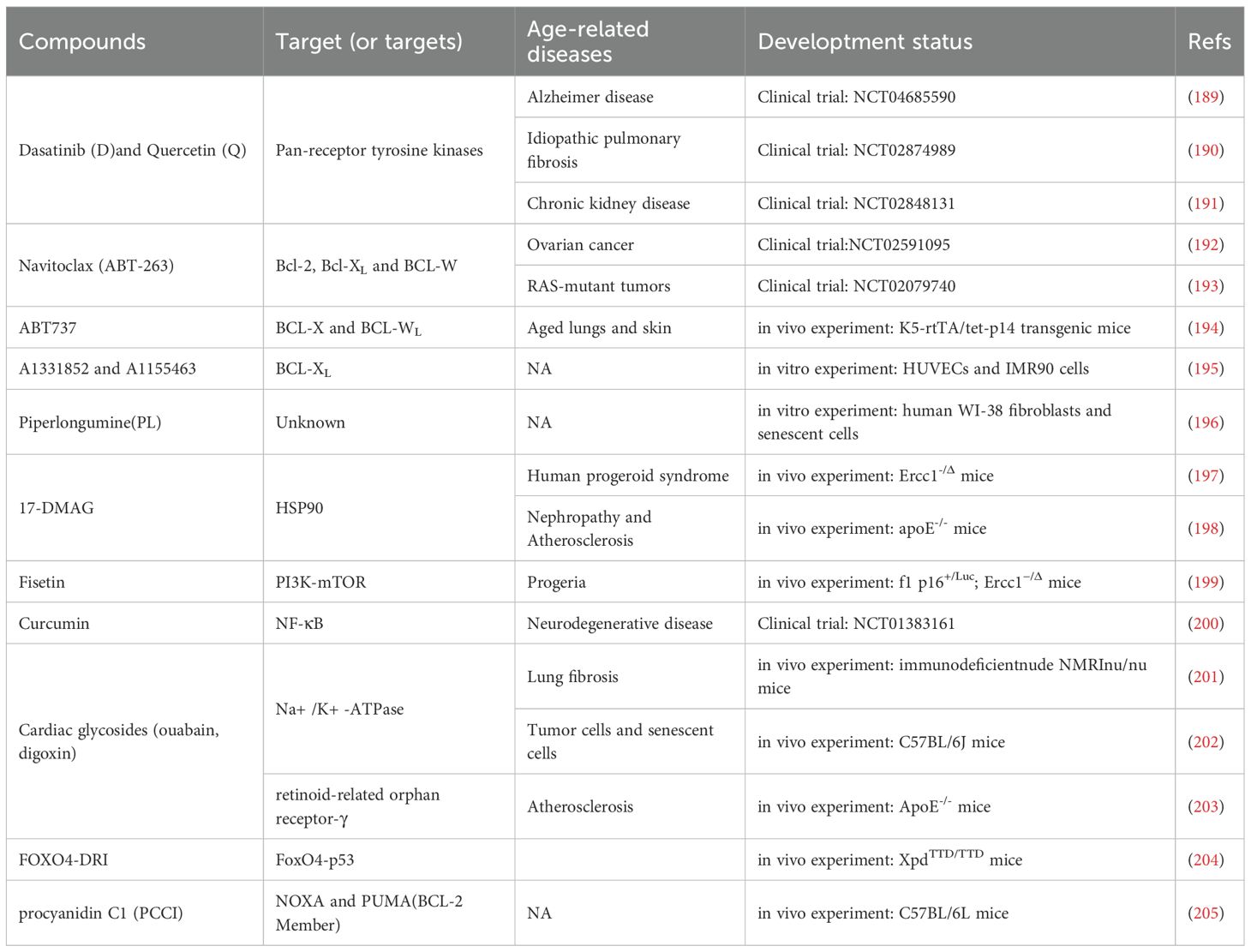 213. Zhu M, Meng P, Ling X, and Zhou L. Advancements in therapeutic drugs targeting of senescence. Ther Adv Chronic Dis. (2020) 11:2040622320964125. doi: 10.1177/2040622320964125