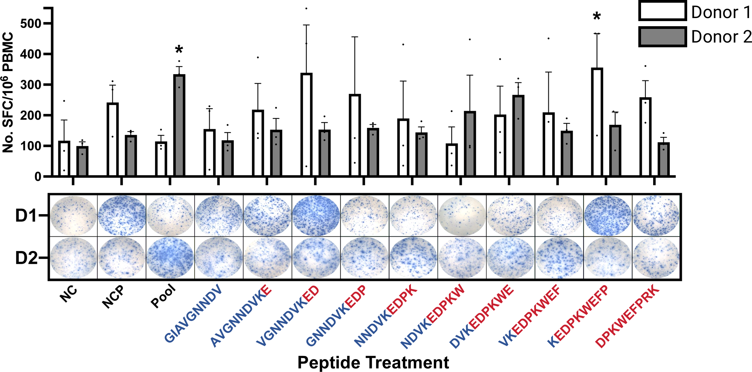 For Donor 1, the peptide sequence KEDPKWEFP triggered a significant immune response compared with the negative control (NC) treatment (Figure 3), consistent with its second-highest predicted binding strength according to HLA-Arena[(Figure 2D (upper panel)]. Additionally, Donor 1 exhibited higher IFN-γ secretion when stimulated with the peptide VGNNDVKED, although this was not considered a positive stimulation in all replicates (Figure 3). This peptide has lower binding energies in in in-silico predictions.