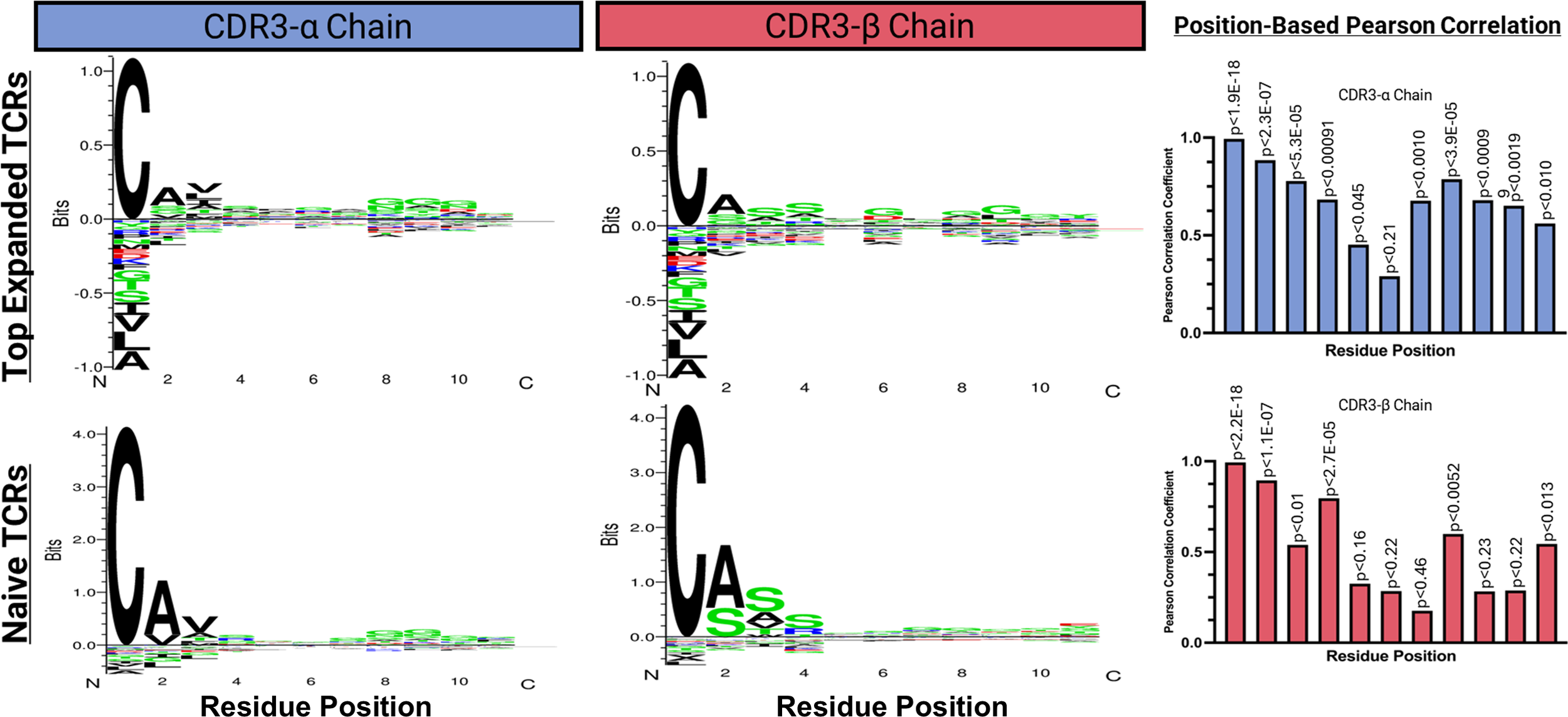 The top 15 variable sequences of CDR3-α and CDR3-β chains were considered as the response-positive dataset and clustered using the methodology previously described (28). Briefly, clustering was performed in GibbsCluster 2.0, with MHC class I configurations and a specified core size of the smallest variable sequence in the positive dataset (34). CDR3 chains found only within naïve populations were used as the negative datasets. The position-specific scoring matrices (PSSMs) yielded from GibbsCluster 2.0 clustering were used to conduct a position-wise Pearson correlation between positive and negative datasets. Correlation significance was assessed using Pearson’s correlation test. Similarity and identity of variable sequences were computed by pairwise sequence alignment using Clustal Omega (RRID: SCR_001591) with standard configurations (35).